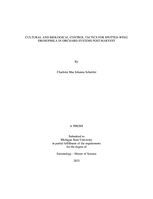 Drosophila suzukii (Matsumura) (Diptera: Drosophilidae) is an invasive, polyphagous vinegar fly with high fecundity and short generation time. Drosophila suzukii, or ‘spotted-wing Drosophila’ has spread quickly across the United States and has quickly become the main pest of concern in tart cherry production. Millions of dollars are spent each year on chemical and labor costs to address this invasive pest. Current management tactics rely upon multiple applications of broad-spectrum insecticides. As populations of D. suzukii resistant to spinosyns and pyrethroids have recently been found in California, alternative management strategies are needed to reduce dependency on chemical control. Recent releases of classical biological control agents have begun across the United States, but their ultimate establishment and potential impact is yet unknown. Innovative methods of cultural and biological control could help restore integrated pest management (IPM) of D. suzukii in cropping systems. This thesis investigates cultural control and biological control methods for managing D. suzukii infestation in post-harvest fruit waste as means of reducing overall populations within an area and potentially decreasing the need for other management methods. Orchard systems often manage disposal of post-harvest crops consisting of any ripe, overripe, and decomposing fruit which may function as a reproductive source for pests. Crushing fruit or adding 15% or 25% organic poultry manure by volume were identified as effective cultural control methods of decreasing the number of D. suzukii and non-suzukii drosophila on post-harvest cherry waste. Adding Hermetia illucens (Linnaeus) (Diptera: Stratiomyidae) larvae to D. suzukii infested fruit waste was found to limit D. suzukii infestation. These cultural and biological control methods can be integrated into existing management programs to help reduce in situ populations of D. suzukii without further addition of insecticides.