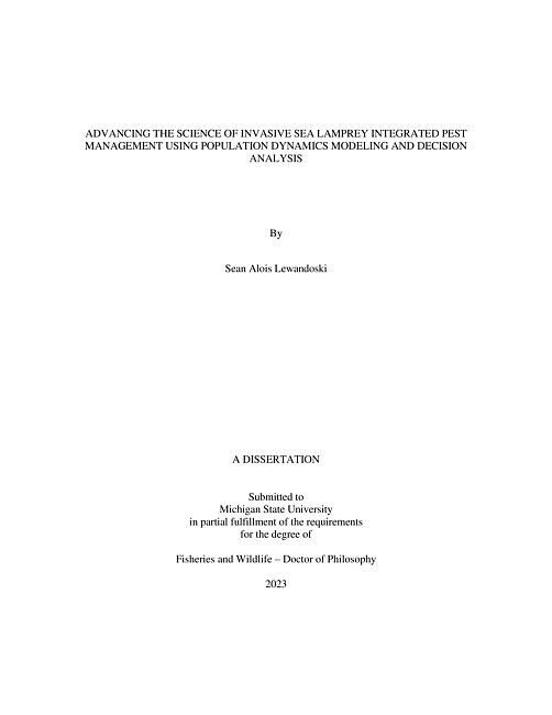 Chapter 1 Resource managers frequently are tasked with mitigating or reversing adverse effects of invasive species through management policies and actions. In Lake Superior, of the Laurentian Great Lakes, invasive sea lamprey populations are suppressed to protect valuable fish stocks. However, the relationship between choice of long-term control strategy and the future chance of achieving the suppression target is unclear. Using a 60+ year time-series of suppression effort and monitoring data from 50 assessment sites located on Lake Superior tributaries, we developed a Bayesian state-space model to forecast the probability of suppressing lamprey below the suppression target. With annual application of lampricide (i.e., lamprey-specific pesticide) at historical mean levels, we forecasted a 15% chance of achieving the Lake Superior sea lamprey suppression target in 2040. Increasing lampricide effort and/or supplementing lampricide control with age-1 recruitment reduction increased suppression chance. Annual application of the maximum historical lampricide effort resulted in a 50% predicted chance of achieving the target, annual application of the mean historic lampricide effort plus a 40% reduction in recruitment resulted in a 54% chance, and the maximum amount of effort considered (maximum historic lampricide and 60% reduction in recruitment) resulted in a 94% chance. We developed a simulation model from a robust, long-term monitoring dataset that improves understanding of why long-term sea lamprey suppression objectives have been difficult to achieve in Lake Superior. Furthermore, the model provides a means to gauge efficacy of sea lamprey control policy and action scenarios based on forecasted chance of achieving the suppression target. Creating processes for iteratively refining our forecasting model with stakeholder and technical-expert input and integration with a decision analysis framework could strengthen the link between ecological knowledge obtained from long-term monitoring and invasive sea lamprey management.Chapter 2 Quantifying fish spatial recruitment dynamics at the sibling group offers a powerful methodology for understanding density-dependent and environmental drivers of recruitment. We propose a continuous-time multistate modeling framework that combines sibship and abundance estimation datasets to estimate mean sibling group size, sibling group size process error, environmental and density-dependent effects on sibling group size, dispersal, and mortality rate. Geographic states in the model consist of discrete habitat patches connected through dispersal. Simulations were used to investigate the influence of sampling processes and mean sibling group size on parameter estimation accuracy and precision for our proposed modeling framework. Mean sibling-group size, environmental effects on recruitment, and dispersal rate among habitat patches could be estimated with high accuracy under a wide range of sampling conditions, including imprecise out-of-model estimates of capture probability, subsampling within habitat patches (extrapolating density estimates to habitat abundance using area expansion), and subsampling among habitat patches. Density-dependent effects on recruitment and process error tended to be estimated with lower accuracy than other model parameters, though accuracy improved as sibling group size increased and sampling intensity increased. The main contribution of this work is a flexible quantitative modeling framework for conducting power analyses and parameterizing mechanistic models of recruitment dynamics in spatially structured fish populations with empirical sibship data. Chapter 3 A major aim of invasive species management is to enact Integrated Pest Management (IPM) principles. However, operationalizing IPM can be challenging due to ecological and values-driven uncertainties. We applied decision analysis to develop a collaborative adaptive management framework that enables effective consideration of the societal and environmental consequences of control tactic selection and use decisions for invasive sea lamprey (Petromyzon marinus) in North America’s Laurentian Great Lakes. We developed a multi-level objective hierarchy that included both localized management and multi-stream coordination fundamental objectives, conducted a feasibility analysis that constrained alternatives to those with high probability of social acceptance and technical success, and quantified expected outcomes of alternatives in terms of multi-stream coordination objectives (minimize costs and maximize learning about efficacy of novel sea lamprey control strategies). Optimal deployment configurations for scenarios that favored maximize learning over minimize costs consisted of a more diverse portfolio of control tactics compared to scenarios that favored cost effectiveness, which demonstrates the sensitivity of sea lamprey control tactic selection and use decisions to values-driven uncertainty. Additionally, sensitivity analyses revealed that optimal deployment recommendations depended upon assumptions about social and technical feasibility. Iterative application of our collaborative adaptive management framework could support social learning and cross-scale linkages if ideas about multi-stream coordination and internal validity of invasive sea lamprey management practices can be exchanged in a trusting environment. Collaborative adaptive management frameworks capable of enabling such social learning may be broadly useful for operationalizing IPM in heterogeneous social-ecological landscapes.