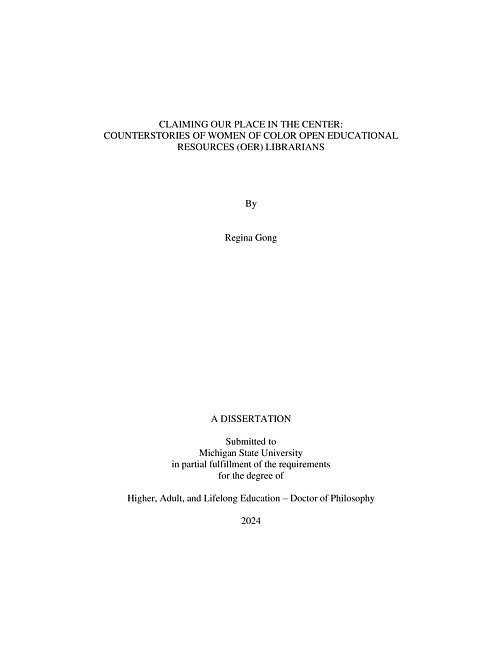 CLAIMING OUR PLACE IN THE CENTER : COUNTERSTORIES OF WOMEN OF COLOR OPEN EDUCATIONAL RESOURCES (OER) LIBRARIANS