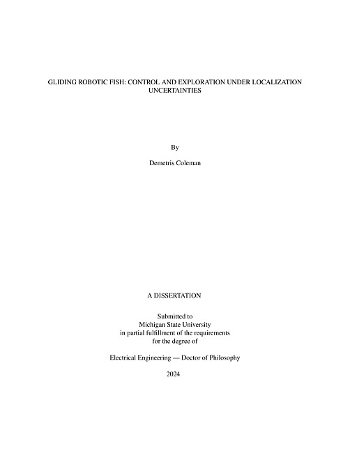 Autonomous underwater vehicles have a variety of applications such as environmental monitoring, search and rescue, ocean exploration, and fish tracking. One such class of these vehicles is gliding robotic fish, which realizes energy-efficient locomotion and high maneuverability by combining buoyancy-driven gliding and fin-actuated swimming. The goal of this dissertation is to endow gliding robotic fish with advanced control capability and autonomy, to facilitate their ultimate applications in aquatic environments.First, an overview of the gliding robotic fish platform GRACE is presented and design improvements for the third generation of GRACE are discussed. These include adding Iridium satellite-based communication for remote operation, making the robot more robust for ocean operation, and developing a miniaturized version (Mini-Glider) to enable rapid testing of functionality and control algorithms. Second, a backstepping-based trajectory tracking controller for the energy-efficient gliding-like motion of gliding robotic fish is proposed. The controller is designed to track the desired pitch angle and reference position in 3D space. In particular, under-actuation is addressed by exploiting the coupled dynamics and introducing a modified error term that combines pitch and horizontal position tracking errors. Two-time-scale analysis of singularly perturbed systems is used to establish the convergence of all tracking errors to a neighborhood around zero. The effectiveness of the proposed control scheme is demonstrated via simulation and experimental results. Next, incorporating observability into control schemes is discussed. Incorporating observability can enhance an observer's ability to recover accurate estimates of unmeasured states, minimize estimation error, and ultimately, allow the original control objective to be achieved. The use of control barrier functions (CBFs) is proposed to enforce observability and thereby encourage convergence of state estimates to the true state in output feedback control schemes. The proposed approach is compared to a model predictive control (MPC)-based alternative that optimizes a weighted combination of an observability surrogate function and the control objective. Motivated by the applications of fish tracking and navigating in GPS-denied environments, the problem of target tracking, when only the distance to the target is measured, is addressed. It is found that both approaches are comparable in terms of observability and estimation error, but the CBF-based approach has an edge in terms of computational efficiency. Experimental validation of the CBF-based scheme is conducted with a Mini-Glider. To complete this body of work, a strategy for the exploration of unknown scalar fields under localization uncertainty is proposed. The strategy hinges on the concept of the multi-fidelity Gaussian processes (GPs) and sampling-based motion planning for information gathering. It uses multi-fidelity GPs to approximate the environmental field by assigning location-measurement pairs to a particular fidelity based on the level of uncertainty in the location estimate. An informative trajectory planner is then designed that plans not only where the robot should go, but also what types of motion (e.g. swimming, gliding, etc.) the robot should use to best gather information for the reconstruction of the field. Experiments are carried out on a Mini-Glider for the task of mapping the light field in an indoor tank. The results show that using a multi-fidelity GP model provides a better reconstruction of the field in terms of the weighted mean squared error when compared to using standard GP regression, where the localization error is ignored.