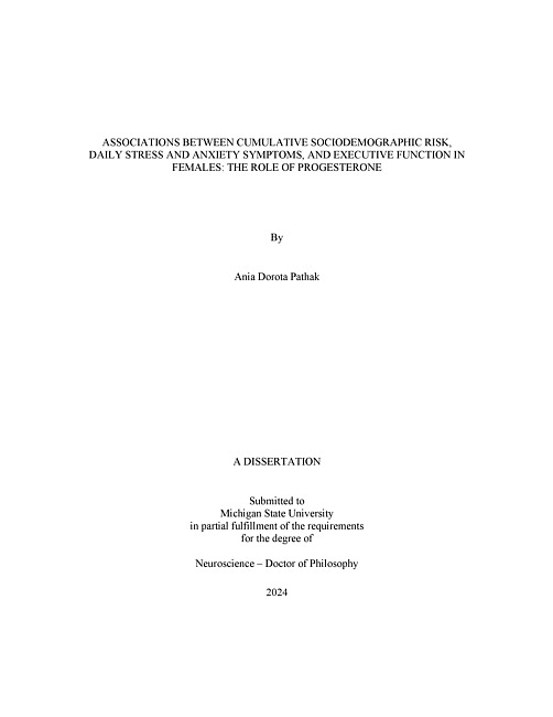 ASSOCIATIONS BETWEEN CUMULATIVE SOCIODEMOGRAPHIC RISK, DAILY STRESS AND ANXIETY SYMPTOMS, AND EXECUTIVE FUNCTION IN FEMALES : THE ROLE OF PROGESTERONE