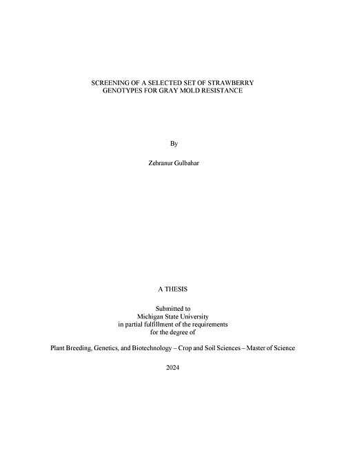 Botrytis cinerea is a necrotrophic fungus that causes gray mold disease in strawberries, leading to significant pre- and post-harvest losses. Considering there are no strawberry cultivars that show complete resistance to gray mold, this research is aimed at screening a selected set of germplasm consisting of both strawberry Cultivars and MSU Lines as promising candidates for breeding parents to develop resistance to B. cinerea, thereby reducing the use of chemical pesticides on strawberries. Our other goal is to see where advanced MSU Lines stand compared to Cultivars for tolerance to B. cinerea. The experiments were conducted in 2021 and 2022 with the fruits harvested from plants maintained in the Pathology Farm at Michigan State University (MSU). In total, 26 different genotypes were examined for their disease severity, Titratable Acidity (TA), and Soluble Solids Content (SSC). The Area Under the Disease Progress Curve (AUDPC) was calculated to quantify the level of tolerance, and the correlation between AUDPC to SSC and TA was analyzed to determine if there is any correlation. Allstar and Camarosa showed moderate tolerance, agreeing with previous studies on determining tolerance in literature. Three MSU Lines, MSU69, MSU78, and 14_30_4 were more tolerant than most of the genotypes evaluated. Although Cultivars performed better in general, many MSU Lines appeared to be significantly better than some Cultivars, such as Earliglow and Jewel. We also observed a positive correlation between SSC and AUDPC for Cultivars; however, TA did not show a correlation with disease severity. Overall, MSU Lines could be stated as moderately susceptible to gray mold; however, MSU69, 78, and 14_30_4 were found to be promising lines to be used as parents along with cultivars tolerant to B. cinerea to increase the level of tolerance in the MSU germplasm.