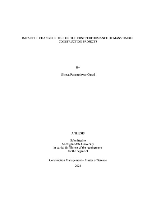 One of the major barriers to the widespread adoption of mass timber as a material is lack of knowledge. This lack of knowledge further promotes issues like high production and construction costs. The construction industry in the United States has been reluctant to accept mass timber as a new technology owing to these higher initial costs. Consequently, the most critical factor affecting the selection of a construction material is its cost performance. A successful construction project is governed by its cost performance. Although, the cost performance of a project can be affected by cost overruns and change orders. These project costs can be optimized by reducing the time. Owing to its prefabricated nature, mass timber construction can cut down time. While change orders negatively affect the time of a project, there is a need to understand their impact on mass timber construction. This study analyzes the impact of change orders on the cost performance of mass timber construction projects. The expected deliverables are to quantify and understand the most common causes of change orders in mass timber projects. The researcher believes that this study is a steppingstone toward the widespread adoption of mass timber as a construction material. Project data was collected for 34 projects from General Contractors around the country. Pearson’s correlation, descriptive statistics, and ANOVAs were used to analyze the data collected. This study observed the relationship between the mass timber scope and the mass timber change orders. Along with that the project delivery methods and their impact on the construction costs was studied. The author believes a more widespread adoption of mass timber is beneficial through project team integration and reduction of change order costs.