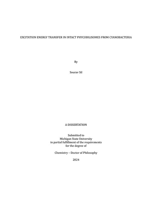 The phycobilisome is the primary light-harvesting protein complex in cyanobacteria and red algae. Phycobilisomes absorb mid-visible solar energy and transfer that energy to PS II and PS I with very high quantum efficiency (> 90%). The mechanisms of this excitation energy transfer process are controlled by the structure of phycobilisomes. Phycobilisomes contain disk-shaped (αβ)6 hexameric phycobiliproteins (PBPs) that prepare cylindrical core and rod-like structures. The rods incorporate blue-shifted PBPs phycoerythrin (PE, λmax = 570 nm) and phycocyanin (CPC, λmax = 620 nm) whereas the core contains allophycocyanin (APC660, λmax = 650 nm). In this way phycobilisomes create a funnel-shaped energy structure where a green photon absorbed by a bilin chromophore (linear tetrapyrrole molecule) in PE at the end of the rod can transfer energy down the rod to CPC to APC660 in the core efficiently. Then excitation moves to terminal emitter (TE) or APC680, a special segment in the core containing red-shifted APC, that transfers energy to PS II or PS I. Broadband two-dimensional electronic spectroscopy (2DES) with 7-fs laser pulses was employed to determine the excitation energy transfer processes in intact phycobilisomes isolated from Fremyella diplosiphon grown under illumination of white light. Excitation transfer can be followed from PE at the end of the rod to the TE through CPC and APC660 by observing the development of below the diagonal cross-peaks in the 2DES spectra at longer waiting time. In the short time the rapidly damped cross-peaks in 2DES spectra strongly suggest the presence of coherences. The global and target model for the 550-580 nm of the excitation strip shows the excitation moves down the rods very fast within 1 ps and reaches to the core in ~10 ps. The evolution-associated difference spectra (EADS) and coherence analysis using FT spectra and oscillation maps indicate that the chromophores in intact phycobilisomes share a common ground state and delocalized excitons present in the rods. Furthermore, coherent wavepackets dominated by the Hydrogen out-of-plane (HOOP) vibration mode of the bilin chromophores, mediate the excitation energy in the rods. Then excitation slows down in the core due to the localization and uses a Förster style mechanism to transfer to the TE. The localization of excitation in the core is accelerated by the intramolecular charge transfer (ICT) character in the lowest energy chromophore (β84) in APC originating from the ring-flipping in the excited state. As a part of the complementary chromatic adaptation (CCA) response, red-light grown Fremyella diplosiphon produce phycobilisomes with shorter rod lengths due to the absence of PE disks at the end of the rods. The effect of shorter rod length can be observed from the kinetic model for the 560-580 nm excitation strip of the 2DES spectrum obtained from the red-light grown phycobilisomes. The model shows a faster energy transfer rate from rod to the core as compared to that of the white-light grown samples. The excited-state lifetimes for TE in phycobilisomes are significantly shorter (~400 ps) than literature reported value (1.5 ns). Time-correlated single photon counting (TCSPC) experiments were performed to understand this phenomenon. Although both white and red light grown samples show ~1.5 ns fluorescence lifetime in TCSPC experiments. Further studies and analysis are required to understand the picture in more detail.