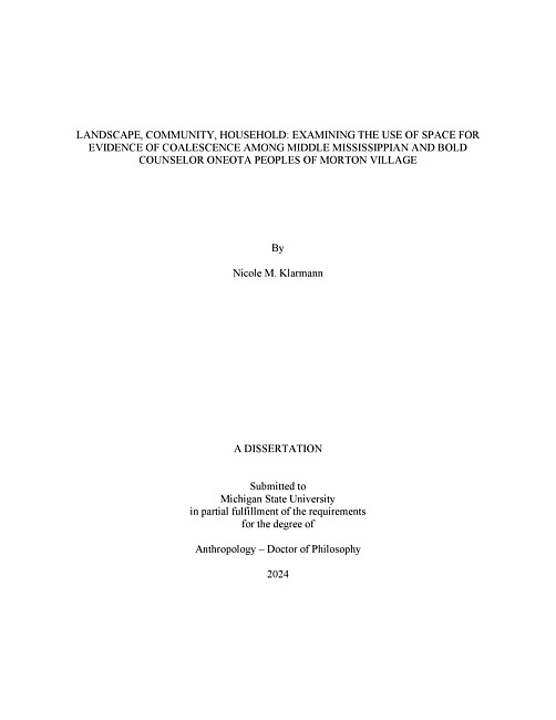 LANDSCAPE, COMMUNITY, HOUSEHOLD : EXAMINING THE USE OF SPACE FOR EVIDENCE OF COALESCENCE AMONG MIDDLE MISSISSIPPIAN AND BOLD COUNSELOR ONEOTA PEOPLES OF MORTON VILLAGE