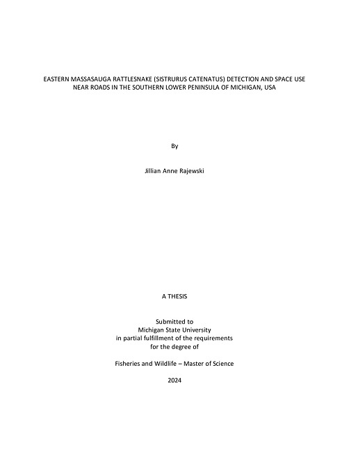 Roads are a mortality source for federally threatened eastern massasauga rattlesnakes (EMR; Sistrurus catenatus) in Michigan, yet we lack a clear understanding of EMR space use and habitat selection near roads. Identifying when, where, and why EMR use spaces near roads could inform decisions to reduce risk of road-related mortalities. Objectives of this research were to survey for EMR at sites along roadsides, report on occupancy probability, demonstrate how weather influences EMR visibility during visual encounter surveys, and explore environmental factors resulting in high EMR space use near roads. During 54 surveys (following previously published survey protocol) 35 sites, five EMR were detected at two distinct sites. Individual EMR surveys had low site-level detection probability (mean = 0.16 (SE = 0.11)), but repeated surveys increased detection probability to near 1.00 at some sites, and visual encounter surveys should be conducted during optimal temperature ranges (~30-40° C in this study). The 24 telemetered EMR at occupied sites were relocated 1-5 times per week, and the percentage of body visible and burrow use was recorded. Body exposure and burrow use were modeled with a Bayesian beta regression to discern when EMR are most visible in active season (April-October; 2020-2022). Estimated body exposure ( ̄x = 42%, SE = 3%, range = 0-100%) increased from ~25% exposure at ~15° C to ~55% at ~40° C. Probability of burrow use was related to Julian day broadly represented the transition from inactive to active seasons, with low probability of use (<0.10) from June to August. Male EMR were less likely ( ̄x = ~0.02%, range = ~2 - 4%) to use burrows than females ( ̄x = ~8%, range = ~2 - 42%). Brownian Bridge kernel home ranges for four (3 – female, 1 – male) telemetered EMR with ≥20 relocations were combined into a single spatial layer representing intensity of snake use. A Bayesian beta regression model predicted intensity of snake use based on environmental covariates. At Site 1, probability of use was greatest ≥70m of the road and correlated negatively with canopy cover (use decreased from 45% at 0% canopy cover to 20% at 90% cover). At Site 2, EMR probability of use increased by 5% (42% to 47%) as distance from the road approached 100m, but use declined sharply by 23% (50% to 27%) approaching 300m from the road. Core use areas for EMR were close (e.g., ≥20 m) to roads, likely due to vegetation management (e.g., mowing), and the physical properties of the roadbed (i.e., warmer below ground temperatures).