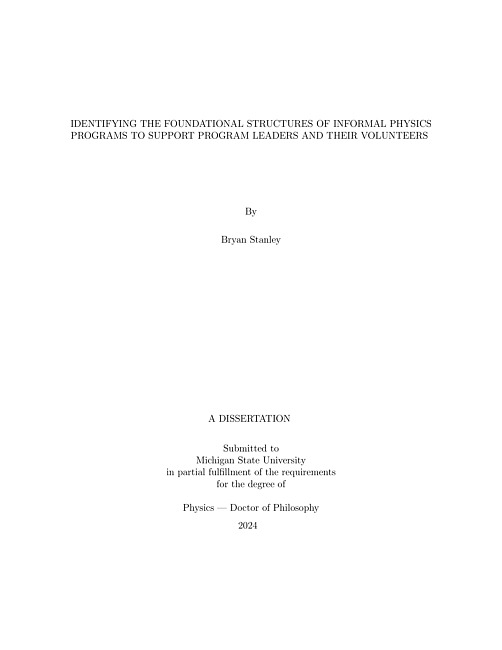Physicists, physics students, and community members engage with each other through avariety of informal physics programs. These programs differ in format, such as after school programs, public lectures, planetariums, summer camps, and other non-formal classroom environments. These programs also differ in the physics topics they cover, activities, audience demographics, frequency of events, and involved personnel. While studies have found that these programs have positive impacts on audiences and volunteers, we do not fully understand the organizational and programmatic structures of these programs or their impacts on those involved with these programs.In this work, I apply an organizational theory framework to understand and analyzesix functional aspects of informal physics programming: Assessment, Audience, Institution, Personnel, Program, and Resources. One finding is that the personnel have a central role in the functionality of these programs, however, program leaders often experience challenges because most of the responsibilities are placed on a single person. Program leaders state they want to do more assessment of their programs, but lack the time, resources, or experience to do so. Building off of my findings, I developed an empirical framework of key components. This framework identifies 12 key components of informal physics programming that program leaders have control over and that are important to the program’s functionality. Identifying these components lays the groundwork for developing tools and resources that program leaders can use to support and improve their programs. Multiple of these components are centered around the recruitment and support of volunteers. Since these are voluntary positions, understanding the motivations of volunteers can help program leaders to better support their personnel. I interviewed alumni who had volunteered in informal physics programs as university students. I applied a volunteerism framework to understand their motivations for volunteering in the first place and the impacts that volunteering had on their career pursuits. The findings of these studies help to identify the aspects of informal physics programs that are crucial for program functionality and how some of these aspects impact those who facilitate these learning spaces.