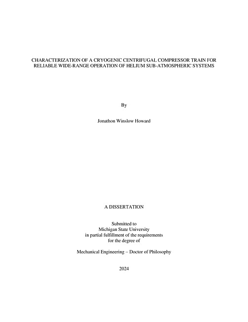 Operation of helium cryogenic systems below the normal boiling point of helium (approximately 4.2 K) has become a common need for modern high-energy particle accelerators. Nominal cooling near 2 K (or a corresponding saturation pressure of approximately 30 mbar) is often required by superconducting radio-frequency niobium resonators (also known as SRF cavities) to achieve the performance targets of the particle accelerator. To establish this cooling temperature, the cryogenic vessel (or cryostat) containing the SRF cavities is operated at the sub-atmospheric saturation pressure by continuously evacuating the vapor from the liquid helium bath. Multi-stage cryogenic centrifugal compressors (‘cold-compressors’) have been proven to be an efficient, reliable, and cost-effective method to achieve sub-atmospheric cryogenic operating conditions for large-scale systems. These compressors re-pressurize the sub-atmospheric cryogenic helium to just above atmospheric conditions before injecting the flow back into the main helium refrigerator. Although multi-stage cryogenic centrifugal compressor technology has been implemented in large-scale cryogenic systems since the 1980’s, theoretical understanding of their operation (steady-state and transient) is inadequate to provide a general characterization of the compressor and establish stable wide-range performance. The focus of this dissertation is two-fold regarding multi-stage centrifugal compressors as used for sub-atmospheric helium cryogenic systems. First, to develop a reliable performance prediction model for a multi-stage cryogenic centrifugal compressor train, validated with measurements from an actual operating system. Capabilities of the model include steady-state performance estimation and prediction of operational envelops that ensure stable and wide-range steady-state operation. Second, to develop and validate a process model of the entire sub-atmospheric system (e.g. FRIB) and establish a simple methodology to obtain a reliable thermodynamic path for the transient (‘pump-down’) process of reducing the helium bath pressure from above 1 bar to the operational steady-state conditions near 30 mbar. The effectiveness of the developed methodology is demonstrated by comparing the estimated and measured process parameters from the sub-atmospheric system studied (i.e. FRIB). The developed model and methodology are intended to benefit the design and operation (both steady-state and transient) of multi-stage cryogenic centrifugal compressor trains used in large-scale cryogenic helium refrigeration systems.
