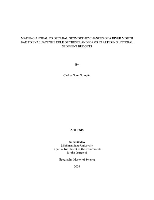 River mouth bars, such as those of the Pinnebog River along Lake Huron’s Saginaw Bay, are dynamic landforms shaped by both fluvial and coastal processes. Although they are prominent features in coastal settings, their influence on coastal geomorphology is poorly understood. These river mouth bars are ecologically important barriers that thwart storm waves from impacting upstream habitats. Given the frequent changes, studying these features and their impacts requires high temporal resolution geomorphic and hydrodynamic data sets. Using high-temporal resolution satellite imagery from Planet Labs, we documented the geomorphic evolution of the river mouth bar and adjacent shoreline over an 8-year period (2016-2023) including the effects of the rise and fall of Lake Huron water level. Wave data USACE hindcast were integrated with NOAA lake level and precipitation data to document the hydrodynamic processes driving the geomorphic behaviors at the river mouth. These satellite and hydrodynamic data indicated river mouth bars are highly responsive to fluctuating lake levels, river discharge and wave events, which alter location of the bar within the nearshore. Former mouths of the Pinnebog River, suggesting over annual periods these river mouth processes exert a measurable influence on nearshore depositional patterns. High temporal satellite images combined with a series of data reveal a highly mobile and dynamic bar affected by lake level, wave conditions and river discharge.