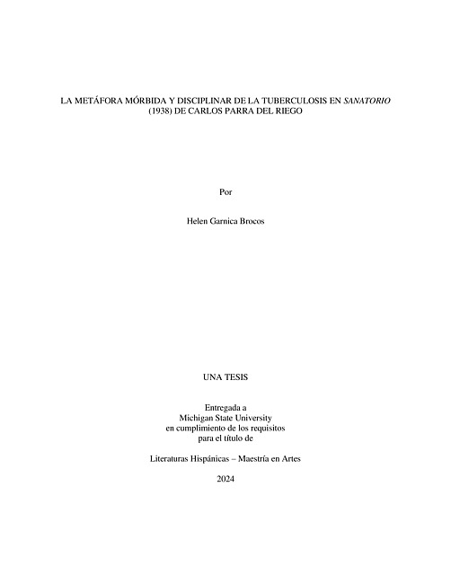 Esta tesis postula que la novela Sanatorio (1938) de Carlos Parra del Riego gesta una concepción metafórica de la tuberculosis al evocar, haciendo uso de la primera persona narrativa, un protagonista llamado Fernández que debe marchar de Lima a Jauja para restaurar su salud. Con este fin, Fernández se asila en el sanatorio Olavegoya que le otorga un estatuto singular al configurarse como un espacio donde existe un pacto tácito de pérdida de libertad, aplicación de un régimen silencioso y de instrumentalización del cuerpo, por lo que el enfermo busca evadir la autoridad médica y la vigilancia de los trabajadores mediante el uso del dinero y la influencia. En aras de estudiar la metáfora de la tisis y la disciplina que detenta el orden del médico, utilizaremos, principalmente, la propuesta de Susan Sontag en La enfermedad y sus metáforas (1978) y El nacimiento de la clínica: una arqueología de la mirada médica (1963) de Michel Foucault, pues ambos filósofos nos ayudan a analizar la particularidad de la “peste blanca”.