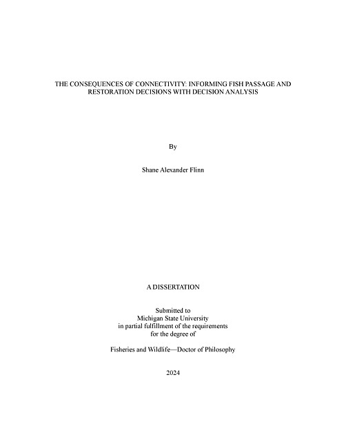 Dams have dramatically altered riverine systems and are a major contributor to native fish population declines. Dam removal is now a common stream rehabilitation practice in the United States; however, many dams serve important ecological, social, and economic functions, such as flood control, invasive species control, and provision of recreational opportunities. Therefore, dam removal is often contentious among stakeholders and involves making tradeoffs among multiple competing objectives. Decision makers benefit from a thorough evaluation of the ecological, economic, and social consequences and tradeoffs of changes to connectivity using decision analysis and predictive models, yet few examples exist in the literature. The objectives of this research were to use a decision analytic framework and predictive models to evaluate the ecological, economic, and social consequences and tradeoffs of enhancing connectivity for migratory fishes in the Great Lakes basin. In Chapter 1, I used structured decision making to engage a diverse group of stakeholders and rightsholders to evaluate the ecological, social, and economic consequences and tradeoffs of enhancing connectivity for migratory fishes in the Boardman-Ottaway River watershed. The optimal management alternative was passage of native fishes only; however, the optimal alternative varied based on the weight stakeholders might place on each objective. Four weighting scenarios were developed to evaluate the change in optimal management alternative with changes in objective weights. In Chapter 2, an individual-based model framework was developed to forecast the response of migratory fishes to changes in connectivity and applied to predict the change in abundance and growth of six species under various fish passage scenarios on the Boardman-Ottaway River. Population response to barrier removal was species-specific and varied based on initial population size and distribution within the watershed, the number of fish passed upstream, and species life history traits. Species that were found only below the barrier prior to removal benefitted most. Non-native species were found to have greater production potential than native Great Lakes basin species under full passage scenarios. In Chapter 3, I evaluated stocking scenarios for lake sturgeon Acipenser fulvescens to aid decision making in the rehabilitation of an imperiled native Great Lakes basin species. Using the model from Chapter 2, several lake sturgeon stocking scenarios were simulated to forecast the potential time to reach a recovered lake sturgeon population. Sensitivity analysis and expected value of perfect information were used to elucidate key areas of uncertainty. The median time to reach the target abundance was estimated to take between 31 and 91 years, depending on the stocking strategy. The results of this research will help inform decision-makers in the Great Lakes basin on management alternatives for fish passage and restoration that are preferred by stakeholders and that are likely to achieve their objectives.
