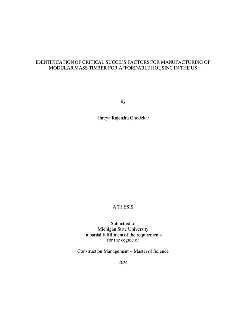 IDENTIFICATION OF CRITICAL SUCCESS FACTORS FOR MANUFACTURING OF MODULAR MASS TIMBER FOR AFFORDABLE HOUSING IN THE US