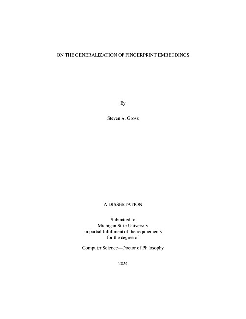 Fingerprint recognition is a long-standing and important topic in computer vision and pattern recognition research, supported by its diverse applications in real-world scenarios such as access control, consumer products, law enforcement, forensics, national identity, and border security. Recent advances in deep learning have greatly enhanced fingerprint recognition accuracy and efficiency alongside traditional hand-crafted fingerprint recognition methods, particularly in controlled settings. While state-of-the-art fingerprint recognition methods excel in controlled scenarios, like rolled fingerprint recognition, their performance tends to drop in uncontrolled settings, such as latent and contactless fingerprint recognition. These scenarios are often characterized by extreme degradations and image variations in the captured images. This performance drop is due to the inability of fingerprint embeddings (feature vectors obtained via deep networks) to generalize across variations in the captured fingerprint images between controlled and uncontrolled settings. The challenges in the generalization of fingerprint embeddings, from controlled to uncontrolled settings, encompass issues such as insufficient labeled data, varying domain characteristics (often referred to as “domain gap”), and the misalignment of fingerprint features due to information loss. This dissertation proposes a series of methods aimed at addressing these challenges in various unconstrained fingerprint recognition scenarios. We begin in chapter 2 with an examination of cross-sensor and cross-material presentation attack detection (PAD), where the sensing mechanism and encountered presentation attack instruments (PA) may be unknown. We present methods to augment the given training data to include a wider diversity of possible domain characteristics, while simultaneously encouraging the learning of domain-invariant representations. Next, we turn our attention in chapter 3 to the challenging scenario of contact to contactless fingerprint matching, where misaligned fingerprint features due to differences in contrast, perspective differences, and non-linear distortions are corrected via a series of deep learning-based preprocessing techniques to minimize the domain gap between contact and corresponding contactless fingerprint images. In chapter 4, we aim to improve the sensor-interoperability of fingerprint recognition by leveraging a diversity of deep learning representations, integrating convolutional neural network and attention-based vision transformer architectures into a single, multimodel embedding. Similarly, in chapter 5, we further improve the robustness and universality of fingerprint representations by fusing multiple local and global embeddings and demonstrate a marked improvement in latent to rolled fingerprint recognition performance, both in terms of accuracy and efficiency. Next, chapter 6 presents a method for synthetic fingerprint generation, capable of mimicking the distribution of real (i.e., bona fide) and PA (i.e., spoof) fingerprint images, to alleviate the lack of publicly available data for building robust fingerprint presentation attack detection algorithms. Finally, in chapter 7 we extend our fingerprint generation capabilities toward generating universal fingerprints of any fingerprint class, acquisition type, sensor domain, and quality, all to improve fingerprint recognition training and generalization performance across diverse scenarios.