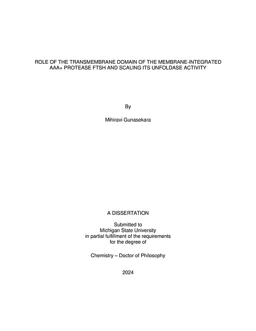 AAA+ proteases are conserved molecular machines for degrading misfolded or superfluous proteins in cells. They utilize the free energy released from ATP hydrolysis to actively unfold a substrate protein on the ring AAA+-ATPase and translocate the unfolded protein to a protease chamber for proteolysis. Among bacterial AAA+ proteases, FtsH is only membrane-integrated and plays a pivotal role in quality control of membrane proteins. Previous studies using water-soluble globular proteins as model substrates have shown that FtsH has weak ATPase and unfoldase activities. This observation led to the proposal that FtsH cannot actively unfold a protein, and ATP hydrolysis is used only for substrate translocation, which confer the protease with an ability to selectively degrade intrinsically unstable or misfolded proteins. However, more recent studies indicate that FtsH can carry out the highly thermodynamically unfavorable processes, denaturation and membrane dislocation of stable membrane protein substrates by cooperatively utilizing ATP hydrolysis. These contradictory results provided a motivation for this study. Here, I clarified the role of the transmembrane (TM) domain of FtsH, that is, whether the TM domain acts simply as a membrane anchor or plays a role in unfolding and recognition of membrane proteins. By comparing, ATPase and unfoldase activities of a series of FtsH variants with modified TM domains against various substrates including both water-soluble and membrane proteins. I find a moderate inhibitory role of the native TM domain in hydrolyzing ATP and unfolding substrates. Surprisingly, FtsH can be converted into a highly efficient ATPase/unfoldase by modifying the TM domain. I also find that being integrated to the membrane does not hinder FtsH’s ability to unfold stable proteins, and this ATP-induced unfolding does not productively lead to degradation. Thus, substrate unfolding and translocation are not necessarily coupled during degradation by FtsH. Our results provide a new insight into energy-dependent protein degradation, that is, each AAA+ protease has a unique mechanism for degrading substrates.