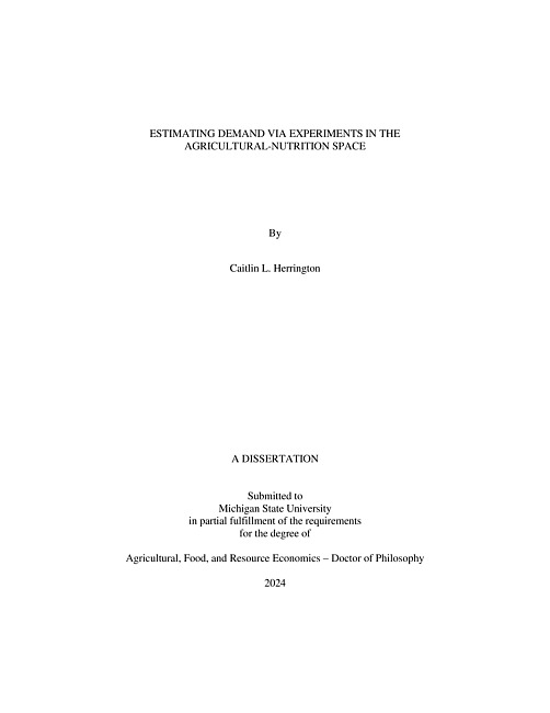 Micronutrient malnutrition affects two billion individuals worldwide, especially developing countries’ rural populations where the majority of food intake is from staple crops. The adoption and consumption of biofortified crops, which are staple food crops conventionally bred to have higher levels of micronutrients and minerals, is one agricultural-nutrition intervention being implemented to increase micronutrient intake. In this dissertation, I utilize experimental auctions to estimate consumer and farmer demand, measured via willingness-to-pay (WTP), for two biofortified staple food crops, rice and beans. I assess how information, farmer aspirations, and the difference in the experimental quantity used versus respondents’ intended purchase quantity impact demand estimates. Findings can be used by implementers, extension agents, and agro-dealers regarding how best to increase demand for biofortified crops.Chapter one examines the effects of nutrition information on rural Bangladeshi consumers’ WTP for two ways to increase zinc intake through rice. I assess zinc intake via low-milling and biofortification of rice with increased zinc content, which is also low-milled to retain maximum zinc content. Results indicate that with information, consumers are willing to pay a premium for zinc biofortified rice compared to non-biofortified rice, when milled at the same level. However, results confirm Bangladeshi consumers’ strong preference for high-milled rice, as they discounted low-milled rice even after receiving information on the nutritional benefits of biofortified or low-milled rice. Therefore, given current consumer preferences, other micronutrient intake interventions, beyond biofortification, should be explored. In chapter two, I examine the role of farmer aspirations on WTP for biofortified bean seed, whose health benefits are considered a medium-term investment. Specifically, I assess if farmers classified as being high aspiring have a higher WTP for biofortified bean and if they respond differently, as evidenced by their WTP, to nutrition and cooking quality information shared about the various bean seed types, via three rounds of bidding. I find that compared to the non-biofortified benchmark seed type, farmers are willing to pay a premium for biofortified bean seed when information is shared. Therefore, biofortified bean seed should be labeled, and nutrition and consumption information should accompany the seeds to elicit maximum demand. So, for initial roll-out, this study recommends targeting farmers that have achieved above a primary school education, that farm larger total land area across all crops, have greater assets, participate in farmer field days, are part of a savings group, and are members of a religious group as these characteristics distinguish high aspiring farmers. Finally, chapter three investigates if, and to what degree, varying bid quantity in WTP elicitation impacts per-unit WTP via a non-hypothetical field experiment using rural Zimbabwean bean farmers. I compare the status-quo approach of small, pre-fixed experimental quantities for bid elicitation versus an innovative approach where the experimental quantity is matched to each respondent’s intended purchase quantity (IPQ). Farmers were randomly assigned to either a fixed quantity group (FQG) where they bid on a 2kg seed pack or a variable quantity group (VQG) where farmers’ experimental quantity was matched to their IPQ. I find that the per-unit WTP is significantly biased upward when bids were elicited using a fixed quantity compared to farmers’ IPQ. This bias was significantly higher for novel (biofortified bean) seeds. I find evidence that this bias in WTP is due to respondents’ IPQ being above the fixed experimental quantity used. These results point to the need for researchers to critically consider the experimental quantity when designing input-based producer WTP studies. The estimated high WTP based on a small experimental bid quantity can have major implications for companies launching new products and in estimating effective demand for agricultural inputs as well as governments setting input subsidy prices.