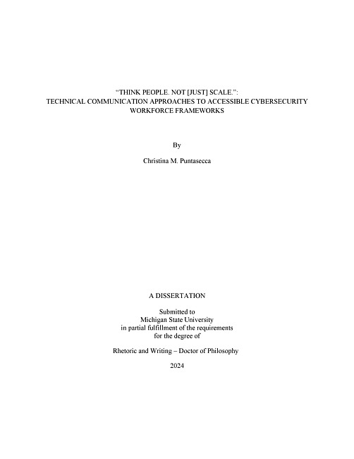Engaging recent points of discussion within academia and practitioner research focused on access/ibility in the cybersecurity workplace, this dissertation examines the impacts of National Initiative for Cybersecurity Education (NICE) cybersecurity workforce frameworks on people and communities within the field of cybersecurity. The emerging era in workforce formation provides a timely opportunity to attend to the conversation around workforce development, pipelines and pathways, and what it means to create greater access to the technical field of cybersecurity for diverse, underrepresented, and/or disabled prospective employees. These developments emerge at a time when the social justice turn in technical communication has become a major focal point in the discipline. Taking up Walton, Moore, and Jones’ foundational work, Technical Communication after the Social Justice Turn (2019) and numerous scholars writing about the need to examine possibilities for justice work within user experience (Swartz, 2019), engaging with issues of linguistic justice and translation in technical communication (Gonzales, 2024; Mendoza, Haywood, Pouncil, and Kang, 2024), arguing for reciprocity in communication (Gonzales and del Hierro, 2017; Haywood, 2019; Powell and Takayoshi, 2003), and attending to questions of ethics in digital research (Haywood, 2022), this dissertation discusses a mixed-methods research study consisting of critical constructivist grounded theory analysis of the 2023 National Initiative for Cybersecurity Education Conference, whose theme titled "Resetting Expectations: Creating Accessible Cybersecurity Career Pathways," focused broadly on reimagining cybersecurity workforce pathways. The dissertation research discusses open ended, reflexive interviews with members of the cybersecurity workforce. Research discussion is followed by recommendations regarding career pathways and workforce development. A closer look into the ways technical communication has historically discussed accessibility and inclusion in digital workspaces, combined with extending the conversation using intersectional frameworks and embodied (third-space) remote work realities post-COVID, may provide new pathways into TCP research.
