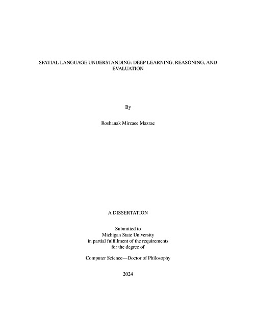 Spatial language understanding plays an essential role in human communication and perception of the physical world. It encompasses how people describe, understand, and communicate spatial relationships between objects and environmental entities, such as location, orientation, distance, and relative position. Spatial language processing presents numerous challenges, which often stem from the inherent ambiguity of natural language in describing spatial relations or the complexity of spatial reasoning to infer indirect relations, particularly when multi-hop reasoning is needed. Despite the remarkable achievements of pretrained language models (PLMs) in various natural language processing (NLP) tasks, their effectiveness in spatial language processing has not yet been thoroughly examined. Therefore, in this thesis, we first aim to evaluate these models’ performance in multi-hop spatial reasoning. Second, we intend to propose deep learning methods and models that can achieve better multi-hop spatial reasoning performance in both controlled and real-world settings. As a result, this thesis has four main contributions to the understanding and reasoning of spatial language. The first contribution is proposing novel question-answering benchmarks to evaluate the spatial reasoning capability of deep neural models. These benchmarks include complex and realistic spatial phenomena not covered in previous work, making it more challenging for state-of-the-art PLMs. The second contribution is an approach to generate large distance supervision for spatial question answering and spatial role labeling tasks to enhance the spatial language understanding of models. We design grammar and reasoning rules to automatically generate a spatial description of scenes and corresponding QA pairs. In this approach, we integrate a diverse set of spatial relation types and expressions, complemented by additional functions, to enhance the flexibility and extensibility of the data generation process. Further training PLMs on this data significantly improves their capability on spatial understanding, thereby enabling them to solve other benchmarks and external datasets better. Furthermore, the third contribution explores the potential benefits of disentangling the processes of information extraction and reasoning in neural models to address the challenges of multi-hop spatial reasoning. To explore this, we design various models that disentangle extraction and reasoning (either symbolic or neural) and compare them with state-of-the-art baselines with no explicit design for these parts. Our experimental results consistently demonstrate the efficacy of disentangling, showcasing its ability to enhance models’ generalizability within realistic data domains. Ultimately, the fourth contribution investigates the role of Large Language Models (LLMs) in multi-hop spatial reasoning tasks, focusing on their performance with and without in-context learning. Besides, we integrate LLMs as extraction modules within a pipeline for extraction and symbolic reasoning. While our case studies in controlled environments indicate the benefits of this idea, our experiments in real-world settings reveal that the model’s efficiency decreases due to escalating errors in the extraction process. We also utilize probabilistic logical reasoning and LLMs’ commonsense knowledge, improving the pipeline model’s performance in real-world applications. Despite these enhancements, the pipeline model continues to exhibit inferior performance compared to standalone LLMs.