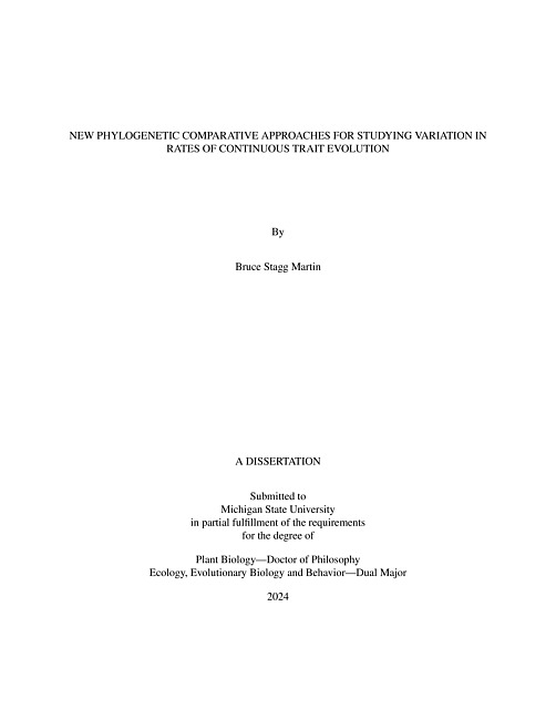 Rates of phenotypic evolution vary tremendously across the tree of life, generating vast disparities in phenotypic diversity across space, time, and taxa. Unfortunately, elucidating the factors driving such "rate heterogeneity" remains challenging due to various methodological limitations. In particular, most available methods for inferring variation in rates of continuous trait evolution assume rates are either influenced by only a few factors (i.e., variables hypothesized to affect rates) or change infrequently over the course of a clade’s history. However, rates of phenotypic evolution are likely affected by a dynamic, tangled web of countless environmental, life history, and genetic factors. By ignoring "residual" rate variation stemming from unobserved factors and assuming relatively simple rate variation patterns, available methods for modeling continuous trait evolution tend to underfit empirical data and mislead hypothesis testing by inflating support for complex models assuming spurious factor-rate associations. Here, to address these challenges, I develop, test, and apply new phylogenetic comparative methods capable of accurately inferring variation in rates of continuous trait evolution and robustly testing for factor-rate associations. In chapter 1, I develop a novel continuous trait evolution model whereby rates constantly and incrementally change over time and across lineages, resulting in continuous, stochastic rate variation across a clade with closely-related lineages more likely to exhibit similar rates. I implement a Bayesian approach for fitting this model to empirical data in an R package, evorates (https://github.com/bstaggmartin/evorates/), along with comprehensive tools for analyzing and visualizing model results. Through simulation, I demonstrate that this method yields accurate inferences and can more reliably detect general decreases/increases in rates over time (i.e., "early/late bursts" of trait evolution) than previous methods by accounting for residual rate variation around overall time-dependent trends. Additionally, I use evorates to show that rates of body size evolution among whales and dolphins have generally declined over time yet exhibit substantial residual variation, with oceanic dolphins and beaked whales exhibiting anomalously fast and slow rates, respectively. In chapter 2, I generalize stochastic character mapping or “simmapping”-based pipelines for inferring relationships between rates of continuous trait evolution and discrete factors (e.g., habitat, diet) to also accommodate continuous factors (e.g., temperature, generation time). Simmapping is a popular method for imputing the uncertain evolutionary history of a trait (or factor) by sampling probable histories along a phylogeny under a given trait evolution model. However, available simmapping implementations only work with discrete variables. Accordingly, I develop a new R package, contsimmap (https://github.com/bstaggmartin/contsimmap/), which implements both a scalable algorithm for simmapping continuous variables and methods for inferring relationships between simmapped continuous factors and continuous trait evolution dynamics. I go on to verify the accuracy and robustness of this new pipeline in estimating factor-rate relationships via an extensive simulation study, even devising a pragmatic new approach to account for residual rate variation, which was ultimately crucial for controlling the pipeline's error rates. Lastly, I use the pipeline to show that rates of leaf and flower evolution are heterogeneous yet unrelated to overall size in a clade of eucalyptus trees ranging from ~1 to nearly 100 meters in maximum height. In chapter 3, I devise a new approach for inferring associations between discrete factors and continuous trait evolution dynamics by jointly modeling the evolution of both discrete factors and continuous traits under a unified process. A key advantage of this method is that it allows the continuous trait data to directly influence the likelihood of different factor histories, enabling inference unobserved discrete factors or "hidden states" potentially driving residual rate variation in continuous trait evolution. I implement this method in an R package, sce (https://github.com/bstaggmartin/sce/), and show that the method can effectively detect and quantify heterogeneity in rates of continuous trait evolution driven by both observed and unobserved factors under a wide variety of simulated evolutionary scenarios. Further, I demonstrate the empirical utility of the new method by using it to rigorously show that tropical sage lineages exhibit elevated rates of flower size evolution compared to temperate lineages.