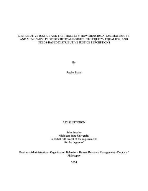 This dissertation explores how menstruation, maternity, and menopause shape distributive justice perceptions within organizational settings. Traditional research on distributive justice has predominantly emphasized the equity principle and neglects the equally important principles of equality and need. By integrating the unique and evolving needs associated with women’s reproductive phases, this study broadens the theoretical and empirical understanding of distributive justice. The theoretical framework in Chapter 3 posits that the physiological and psychological experiences associated with menstruation, maternity, and menopause create a context of uncertainty that reveal critical insights into how needs-based resources shape perceptions of distributive justice. Then in Chapter 4, the empirical studies use a quasi-experimental longitudinal field study and experimental design to investigate how uncertainty associated with menstruation impacts employees’ distributive justice perceptions when organizations provide needs-based resources. Together, my theorizing and empirical results indicate that needs-based resources influence needs- and equality-based distributive justice perceptions more than equity-based distributive justice perceptions, and the results underscore the inadequacy of equity-focused distributive justice measures in capture the full spectrum of distributive justice perceptions.
