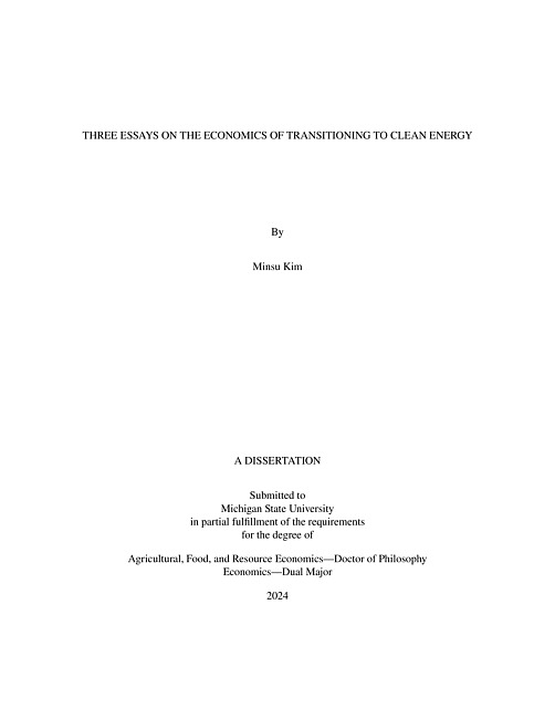 Human activities have caused widespread, rapid, and intensifying climate change. Overshooting 1.5 ◦C is inevitable in 2024, while substantial scientists have warned that irreversible changes will settle down in many places over the Earth after a 2 ◦C increase since 1850-1900. We must find a way to mitigate climate change, study its impact on our society, and build sustainable communities. Nevertheless, it isn’t easy to find a socially desirable implementation of an environmental policy due to its complexity and various stakeholders. This dissertation contributes to finding socially desirable ways of tackling climate change in energy transition.The first chapter, titled “Incentivizing capital investments in electric vehicle attributes to stimulate demand,” studies the optimal subsidization of electric vehicles (EV) by stimulating investment in industries. Aggressive automobile emissions reductions are required to tackle climate change. The US government has subsidized electric vehicles (EV) with a constant purchase subsidy of $7500 to promote the transition from internal combustion engines (ICE). In this chapter, I analyze the optimal subsidies for EV adoptions, considering both purchase and investment subsidies. The theoretical model includes firms’ dynamic Bertrand game of price and investment and a government’s dynamic Stackelberg game with firms. Firms maximize their benefit with price and investment decisions under a fixed number of new market sales yearly. Experience curve decreases their unit production cost and increases the attribute as capital accumulation. Consumers discreetly choose vehicles with price and attributes. Governments maximize social net benefit with subsidy decisions considering all surplus, expenditure, and social costs of carbons. I run this theoretical model by estimating data for every vehicle model sold in the US from 2008 to 2019 and calibrating the model by the collocation method. I show that the two dynamic policies have the same trend, in which the optimal intervention begins at high values to spur early adoption before falling and approaching zero as EV firms’ capital grows. In the two dynamic policies, the optimal policy intervention is very high at the capital level in 2024: $10694 to $16073 (purchase subsidy) and $17.06 billion to $40.58 billion (investment subsidy). Then, the optimal policy shrinks rapidly as EV capital increases. The optimal path leads us to the equilibrium where ICE capital becomes much less, while EV capital remarkably increases compared to zero policy. Dynamic purchase and investment subsidy increase the total net present value social net benefit by $2.32 trillion (3.84%) and $1.44 trillion (2.39%) compared to zero policy and by $923 billion (1.49%) and $47.7 billion (0.08%) compared to the current constant policy. It sheds light on the optimal market intervention. Governments should strongly intervene in the market first, gradually reducing their policy as the new business grows.The second chapter, titled “Peer effects in electric vehicle adoption,” captures the peer effect of EV adoption in Michigan, considering spatial dependence. The market competitiveness of EVs has been improved as many countries have introduced policies for stimulating EV adoption. However, a prior understanding of consumer behavior is required to achieve that goal because those policies try to alter the choices of consumers or firms in the market. Substantial literature focuses on the consumers’ substitution pattern of vehicles. The peer effect has been widely used to explain consumer behaviors, especially for products in the early stage of business. Nevertheless, there is little literature on the peer effect on EVs. Consumers may hesitate to purchase an EV at first; however, if they observe more EVs in their neighborhood, on the road, or in parking lots, their reluctance to purchase an EV may be resolved. I use spatial panel regression with EV registration and charging port panel data by ZIP Code Tabulation Area (ZCTA) from 2013 to 2019 in Lower Michigan to address the spatial dependent trend. I adopted the spatial error and autocorrelated models and compared the results with other spatial models. It shows that one increase in cumulative EV adoption at the same ZCTA will increase next year’s EV adoption by 0.326 to 0.352 cars. One cumulative EV adoption increases EV adoption in the same ZCTA by the same amount of an income increase of $1125 to $1254. The policy should be set to adopt the EV aggressively to take advantage of the peer effect, which strengthens the aggregate demand for EV adoption.The third chapter, titled “The impact of transnational municipal networks on local energy consumption,” is co-authored with Dr. Sun-Jin Yun and published in Urban Climate. Local governments are essential to the successful implementation of climate policies. They know where funds should be allocated and how to increase efficiency at the local level. Transnational municipal networks (TMNs) have galvanized local climate action by sharing best strategies and supporting communication. This study asks whether and to what extent the International Council for Local Environmental Initiatives – Local Governments for Sustainability (ICLEI), one of the major TMNs in climate action, affects local energy consumption in South Korea. We use a staggered difference-in-differences (DID) method, which is a robust alternative under staggered treatment, with a strongly balanced panel dataset across 226 Korean counties between 2005 and 2019. We find that ICLEI membership leads to a significant decrease in energy consumption per capita 4.53% to 6.62% with county membership, 8.91% to 9.00% with state membership, and 11.8% to 21.4% with both county and state membership. In addition, state membership shows a growing impact on energy consumption reduction, while county membership has a weaker trend. The results are statistical evidence of the role of TMNs in loc