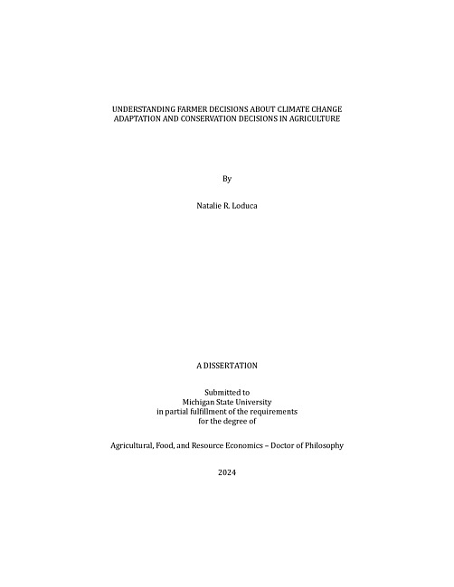 As farmers adjust to the evolving climate, they alter their farming practices and technologies to manage the risks associated with changing crop yields. These adjustments can range from minor changes like tweaking crop insurance coverage to major investments such as adopting irrigation systems. Their responses are influenced by their risk preferences and perceptions of how climate change will affect the risks they face. Additionally, government incentives can play a role in shaping these behavioral responses. This research contributes to the existing body of knowledge by delving into the drivers of farmer decisions in the context of climate change.The first chapter of this dissertation empirically estimates the risk aversion of 44 corn-soybean farmers in Michigan under different utility function assumptions. We then compare risk aversion across these utility functions and between general lottery choices and choices related to agricultural investments that can mitigate weather risk. We compare the fit of three utility models—constant absolute risk aversion (CARA), constant relative risk aversion (CRRA), and nonconstant risk preferences—and chose the CRRA model as the most suitable for our application. We estimate risk preferences at both the sample- and individual-level, to compare drivers of risk aversion in each lottery setting. While the sample-level estimates of CRRA are similar across lottery settings, individual-level comparisons reveal greater variability in risk preferences within the agricultural lottery setting. In the general lottery, participants' age significantly influences risk preferences, whereas wealth (measured by acres in operation) significantly impacts risk preferences in both lottery settings. Simply measuring farmers' risk preferences without considering contextual factors fails to capture the diversity in preferences and the factors driving this heterogeneity.The second chapter of this dissertation explores the connection between farmers' risk preferences, perceptions of crop yields, and decisions regarding climate change adaptation. Drawing on the same 44 interviews, we construct perceived crop yield distributions under investment scenarios for tile drainage, center pivot irrigation, and drought tolerant seeds to identify the perceived efficacy of these practices. We uncover that farmers foresee shifts in future crop yield distributions, anticipating rising means with greater variances. Individuals who perceive a larger increase in expected crop yield from irrigation adoption are more likely to be currently using center pivot irrigation or be considering adopting irrigation. Meanwhile, participants who believe that tile drainage will increase their crop yield variance are less likely to adopt drainage. Assessing risk preferences and subjective crop yield distributions across different technology scenarios enables us to identify the key factors influencing adaptation adoption decisions.This dissertation's third and last part explores how the U.S. Department of Agriculture Natural Resource Conservation Service (NRCS) cost-share programs encourage the adoption of cover crops across the Midwest. Cover crops provide both public ecological benefits, such as improving air and water quality, and private benefits to farmers, such as improved soil health and reduced soil erosion. Analyzing NRCS cover crop contract county level data, we find that an increase in the cost-share proportion translates to an increase in enrolled acres, which provides evidence of additionality. Results also indicate that the basic single species cover crop contract is the most popular, and higher adoption rates correlate with lower precipitation levels in the preceding growing season. Using remote sensing data, we test the relationships between enrolled cover crop acreage and conservation tillage practices. We do not find positive learning and peer effects from previous enrollment in cover crop contracts, but we do see a positive relationship between cover crop and no-tillage acreage. These findings deepen our understanding of the drivers behind cover crop adoption and shed light on the effectiveness of government incentives in promoting sustainable agricultural practices.