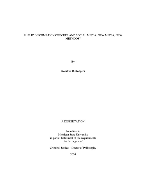 Police public information officers (PIOs) serve as spokespersons for their departments and are often considered gatekeepers of information to the public. PIOs work with media to ensure information is put out in a timely manner and to manage department image. The media landscape has drastically shifted in the past decade, particularly with the introduction and popularity of social media. The role of the PIO has also continued to become more professionalized as departments realized the importance of the position. Prior to this study taking place, two major events took place: the COVID-19 pandemic and the murder of George Floyd. These events cannot be ignored and may have impacted the role of PIOs as well as their use of media. With these advances and context in mind, this dissertation sought to fill the dearth of information about the current role of the police PIO in the U.S., to examine how organizational and institutional pressures may impact this role, and to understand PIOs’ responses to a few high-profile cases. To accomplish this goal, a national survey of PIOs was conducted (N=144) and linked with collection of public social media data and organizational characteristics. Analysis of the survey results revealed that PIOs now use and prefer social media for many job tasks, but still also use more traditional media. Social media also seems to have removed the barrier of traditional media gatekeepers, allowing for PIOs to craft their messages, responses, and department image more directly. This study also found individual and organizational factors that influence PIOs social media outputs include PIOs perception of their competence with social media, enjoyment of social media, view of importance of social media, diversity of the area served, and size of the agency. Finally, the major events of 2020 were found to bring stress to the role of the PIO. COVID-19 moved even more of the PIOs’ role online and required a shift in engagement strategy. In a shift back, the murder of George Floyd required PIOs to connect with their community again, sometimes offline. This dissertation serves as an update to our understanding of the role of the PIO and a beginning to our understanding of how PIOs responded to drastic shifts in the media environment and how organizational theory components may impact PIOs’ use of social media. Finally, this dissertation was uniquely situated to capture PIOs’ responses to the high-profile events of 2020, which highlighted how major events impact the role of the PIO and how important context is to their work.
