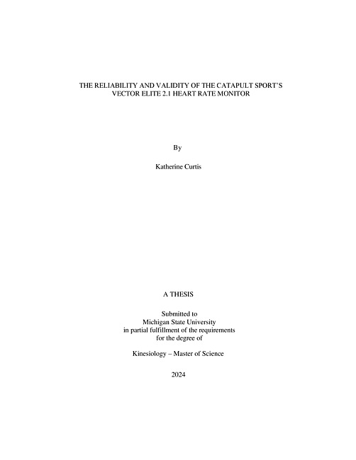 Heart rate monitors are commonly used in sports with a large aerobic emphasis to monitor exercise intensity. Female athletes who participate in endurance sports such as field hockey and soccer are also at an increased risk for experiencing training maladaptation (Schwellnus, 2016). Wearable technology is utilized by practitioners to monitor athlete training characteristics. Catapult Sports has combined GPS technology and heart rate monitors to increase the utility of their garments. Catapult Sports’s GPS component has been deemed valid and reliable (Varley 2012). However, the heart rate monitor has not been investigated by a third party. Therefore, the purpose of the study was to assess the reliability and validity of the Catapult Sports's Vector Elite 2.1 heart rate monitor in female athletes. It was hypothesized that the Catapult Sports’ Vector Elite 2.1 heart rate monitor would exhibit good intra-device reliability (ICC = at least 0.7) during rest, moderate and vigorous exercise intensities. It was also hypothesized that the Catapult Sports’ Vector Elite 2.1 heart rate monitor measurements during rest, moderate and vigorous exercise would exhibit a Pearson correlation of at least 0.7 when compared to a single-lead EKG. There would be minimal bias within 95% limits of agreement. Additionally, an acceptable coefficient of variation of 5-10%. A total of 27 division I female field hockey (n=17) and soccer (n=10) were recruited. Participants performed two VO2max tests while wearing the Catapult garment and a single lead EKG to obtain maximum and average heart rate values for each test stage. Overall, the reliability of the heart rate monitor decreased at intensity decreased. The Catapult garment was not valid as intensity increased. Overall, the Catapult heart rate measurements displayed good accuracy during resting conditions and stage one but lost accuracy as intensity increased.