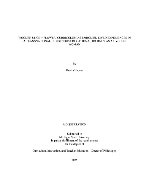 My dissertation is a multi-media autobiography presented through three integral parts: exhibition spaces in the Kresge Art Center and the Digital Scholarship Lab at Michigan State University (MSU); a final photobook, inclusive of a booklet with written narratives; and a pedagogical component showcased during the reception event in the gallery space. This comprehensive body of work explores themes of displacement, land(s), time, belonging, identity, loss, and memory through my personal lens as a Uyghur woman. Born and raised in the region referred to as China and currently residing in the so-called United States, my transnational lived experiences profoundly shape my perspective in examining these concepts.