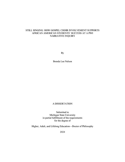 ABSTRACT Still Singing: How Gospel Choir Involvement Supports African American Student Success at PWIs By Brenda Lee Nelson This paper investigates the perceptions and experiences of graduated African American students regarding the effects of campus gospel choir involvement on their persistence at Michigan State University (MSU). Drawing upon the frameworks of Aston's Input-Output-Environment (IOE) model, Tinto's Theory of Belonging, and Kuh's High-Impact Practices (HIPs) theory, a narrative inquiry methodology is proposed to develop into the rich narratives and lived experiences of six African American students. The study seeks to highlight the potential benefits of gospel choir involvement in fostering a sense of belonging, support, and academic persistence among this student population at PWIs.