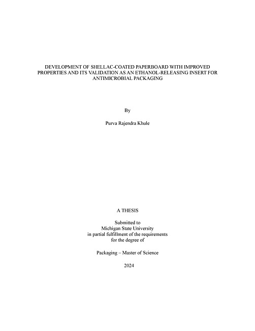 Fiber-based materials are gaining attention as packaging materials for food and other products. Coatings are required for fiber-based materials to perform as needed. Replacing the petrochemical-based coatings used in fiber-based packaging materials with environmentally friendly alternatives to retain recyclability and biodegradability is desired. These alternatives should offer large-scale manufacturability, low cost, and barrier properties like petrochemical-based coatings for adoption. Shellac is a natural resin with good film-forming properties and hydrophobicity; still, very scarce information on shellac-coated fiber-based materials is available. It opens new possibilities for fiber-based packaging materials based on property improvement (e.g., enhanced barrier) and the capability to carry antimicrobial compounds. This study aims to develop, characterize, and validate multilayer shellac-coated bagasse paperboard with enhanced properties and the ability to release antimicrobial (ethanol). Part 1 of this thesis focuses on the properties improving properties of bagasse paperboard with the effects of shellac layering and concentration. Parts 2 and 3 focus on validating the developed shellac-coated paperboard as an ethanol emitter, its ethanol-releasing capacity, effectiveness against fungal growth (in-vitro studies), and a shelf-life study using packaged strawberries. Bagasse paperboard coated with 2 layers of 40% shellac showed 82% (water vapor permeability), 98.8% (oxygen permeability), and 97% water resistance improvement compared to uncoated paperboard. The bagasse paperboard coated with 40% shellac coating can withstand higher temperatures than cast film. Bagasse paperboard coated with 4 layers of 40% shellac released. 14,200 μL ethanol/L air (ppm) on day 1 and then showed a bi-phasic pattern (80% release within the first 10 days and the rest within 15 days). This ethanol-releasing paperboard reduced Penicillium spp. growth by 50% for 4 days and Botrytis cinerea growth by > 98% for 7 days in in-vitro studies at 23 °C. The developed shellac-coated bagasse paperboard when used as ethanol emitter inside packages with Botrytis cinerea-inoculated strawberries reduced mold growth by 30% and strawberry darkening while having no negative effect on fruit respiration, transpiration, and firmness at 23 °C. The developed multilayer shellac-coated paperboard has the potential to be used as a packaging material for food including more sustainable antimicrobial packaging by replacing plastic-based ethanol emitter.