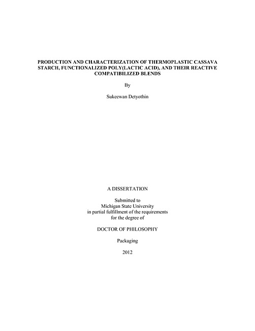 Cassava starch was blended with glycerol using a co-rotating twin-screw extruder (TSE). Thermoplastic cassava starch (TPCS) at a ratio of 70/30 by weight of cassava/glycerol was selected and further blended with other polymers. TPCS sheets made from compression molding had low tensile strength (0.45 ± 0.05 MPa) and Young's modulus (1.24 ± 0.58 MPa), but moderate elongation at break (83.0 ± 0.18.6%), medium level of oxygen permeability, and high water vapor permeability with a very high rate of water absorption. TPCS was blended with poly(lactic acid) (PLA) at various ratios by using a TSE. The blend resins exhibited good properties such as increased thermal stability (Tmax) and crystallinity of PLA, and improved water sensitivity and processability of TPCS. PLA and TPCS exhibited a high interfacial tension between the two phases of 7.9 mJ*m-2, indicating the formation of an incompatible, immiscible blend. SEM micrographs showed a non-homogeneous distribution of TPCS droplets in the PLA continuous phase. TEM micrographs of the blend films made by cast-film extrusion showed coalescence of the TPCS droplets in the PLA continuous phase of the blend, indicating that the compatibility between the polymer pair needs to be improved. A response surface methodology (RSM) design was used to analyze the effects of maleic anhydride (MA) and 2,5-bis(tert-butylperoxy)-2,5-dimethylhexane (Luperox or L101) contents, and TSE screw speed on the degree of grafted MA and number average molecular weight (Mn) of functionalized PLA (PLA-g-MA), a reactive compatibilizer. PLA-g-MA made by reactive extrusion had an array of colors depending on the content of L101 and MA used. New FTIR peaks suggested that MA was grafted onto the PLA backbone and oligomeric MA may occur. Increasing L101 increased the degree of grafting and decreased Mn, but the Mn of the PLA-g-MA's produced with a high amount of L101 was stable during storage. MA exhibited an optimum concentration for maximizing the degree of grafted MA, and increasing MA content retarded the reduction of Mn during processing. However, the Mn of PLA-g-MA during storage decreased more rapidly with a high content of MA. TSE screw speed had an impact on the Mn with the maximum value predicted at 20 rpm. PLA-g-MA compounds differing in Mn and/or grafted MA content were used as reactive polymers with TPCS (to produce binary blends) and as reactive compatibilizers (to produce ternary blends of PLA/TPCS/PLA-g-MA) with TPCS content of 30 wt% using a TSE. As a result of maleation, PLA-g-MA had a higher grafted MA content with a lower Mn, and higher PI. The interaction of anhydride groups from PLA-g-MA and hydroxyl groups from TPCS was found by FTIR. The reactive binary blends exhibited a change in thermal stability, decrease of Tcc, the presence of double melting peaks, and an increase of the Tgs of glycerol and starch. The higher the grafted MA content and/or the higher Mn of the PLA-g-MA used, the better were the distribution and smaller the TPCS domains obtained in the blends. The highest elongation at break was achieved when 30 wt% TPCS was blended with 70 wt% of PLA having 0.1 wt% of grafted MA and Mn of PLA-g-MA with a 45 kDa. Finally, the optimum PLA-g-MA was determined by using the results from PLA-g-MA RSM design and the reactive blending.