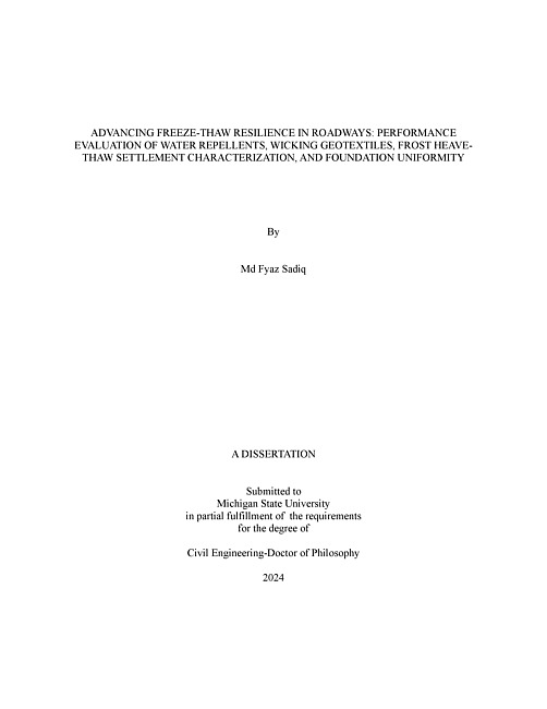 ADVANCING FREEZE-THAW RESILIENCE IN ROADWAYS : PERFORMANCE EVALUATION OF WATER REPELLENTS, WICKING GEOTEXTILES, FROST HEAVE-THAW SETTLEMENT CHARACTERIZATION, AND FOUNDATION UNIFORMITY