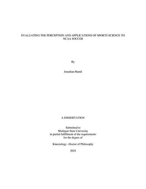 Nearly fifty thousand student-athletes compete for an NCAA Men’s and Women’s soccer program at the Division I, II, or III level. Many of these programs have began adopting sports science, or the application of scientific principle and technique, to optimize sports performance. It is unclear who is tasked with carrying this responsibility out at the NCAA level and how. The purpose of this dissertation is to examine these responsibilities and demonstrate application of sports science to NCAA men’s and women’s soccer. The first study aims to evaluate the perceptions of sports science applications and the sports scientist role in NCAA soccer using an exploratory survey study design consisting of questions about demographics, program capabilities and practices of training load monitoring, training and practice planning, and training load monitoring feedback. Respondents (n = 187) consisted of sport coaches (n = 128), strength and conditioning coaches (n = 45) and sports scientists (n = 13). Traning load monitoring tools most commonly included questionnaires and session rating of perceived exertion (sRPE). The head coach was identified to most typically be responsible for training planning. To communicate training load information throughout a program, verbal, informal communication (62.6%) was the most commonly employed communication channel. Future resources and trainings about training load monitoring and management may be most beneficial if directed towards coaches provided their responsibilities in managing training loads at the NCAA level. Study two considered how training loads are managed within a program and is intended to identify the distribution of training loads throughout the in-season NCAA men’s and women’s soccer microcycle. Soccer field players from an NCAA Division I program wore GPS and accelerometer monitors throughout the Fall 2021 season for all training sessions and matches. Players were categorized into bench, substitute, and starter while days throughout each microcycle were classified according to the number of days before match day. Linear mixed effect models were used to examine the effects of player role and day of microcycle on external training loads. Match day elicited the greatest training loads during the microcycle. The day prior to the match (MD-1) elicited the lowest. Starters accumulated the greatest training loads for all measures except total sprint distance. Total playerload and medium- and high-intensity accelerations and decelerations were significantly greater amongst the men compared to the women. Provided that most training load is developed on match day by starters, presenting substitutes and bench players with supplemental training load could better prepare these players for starter match demands. The final study measured physical performance fatigue and its effects on soccer performance indicators. A Division I Women’s soccer program was evaluated using GPS to aquire physical performance measures while technical performance measures were aquired from a match analysis platform for all matches (n = 23) and halves. To evaluate reductions in team performance between halves, paired sample t-tests were used. Little indication of physical performance fatigue between halves was observed. Total distance and HIR distance were similar between halves. Greater player utilization was observed from the first- to second-half. Technical performance decrement was observed as the team allowed opponents more shots (mean diff: -1.87, p < 0.001), experienced a reduced possession percentage (mean diff: 4.20, p < 0.04), and reduced passing accuracy (mean diff: 2.95, p < 0.05). Together, these results demonstrate that physical performance fatigue was relatively limited from the first- to second-half despite curtailed technical performance which may reflect the increased use of substitutions within a match, reducing technical skill across the program while maintaining physical fitness.