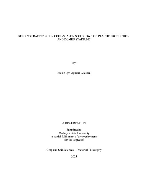 The demand for natural turfgrass in professional sports is increasing due to concerns over higher injury rates associated with artificial turf. However, domed stadiums often use artificial turf because these venues host events that do not require natural grass. To provide a temporary natural turfgrass playing surface, a shallow turfgrass profile – consisting of big roll sod grown on plastic (SOP) over geocellular drainage modules – has been developed. Kentucky bluegrass (Poa pratensis L.; KBG) is a commonly used cool-season grass in SOP production for sports fields, but it faces challenges due to its slow germination, which can lead to potential soil erosion during the early stages of establishment. Perennial ryegrass (Lolium perenne L.; PRG), known for its rapid germination, may stabilize the soil while KBG is still germinating. However, the optimal seeding ratios for combining these grasses in SOP production and domed stadiums remain unclear. Three studies were conducted: the first two studies focused on SOP production at the Hancock Turfgrass Research Center in 2023 and 2024, and the third study focused on controlled environments at the FIFA Indoor Pitch Simulator Facility in 2024. The first study aimed to evaluate the effects of different KBG:PRG seeding ratios (100:0, 98:2, 96:4, 92:8, 84:16, 0:100) on cool-season SOP production. After four months, results indicated that even a small percentage of PRG significantly enhanced turfgrass cover, with the 84:16 KBG:PRG mix showing a 58% increase in tensile strength compared to the 100:0 ratio. This suggests that the 84:16 ratio is optimal for producing harvestable KBG-dominated sod in a short time frame. Unexpectedly, pure PRG (0:100) exhibited the highest turfgrass cover and tensile strength among treatments, highlighting the potential for PRG in SOP production. Hence, the second study aimed to determine the optimum PRG seeding rates (1.5, 3, 6, and 9 pure live seeds cm−2) for SOP production. Results showed that the 1.5 PLS cm−2 rate exhibited lower turfgrass coverage and shear strength at 4 weeks after seeding but higher tensile strength at 12 weeks compared to the higher seeding rates. The rates , 1.5 and 3 PLS cm−2 , were identified as optimal for balancing turfgrass coverage and sod harvestability. Lastly, the third study aimed to investigate the effects of different KBG:PRG seeding ratios (100:0, 98:2, 96:4, 92:8, 84:16, 0:100) during SOP production on turfgrass quality and performance under artificial lighting and trafficked conditions. Results indicated that traffic application significantly reduced turfgrass color and green cover, but KBG:PRG ratios showed similar performance in turfgrass color, percent green cover, maximum shear stress, and maximum displacement.