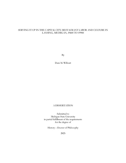 Serving it Up in the Capital City: Restaurants, Labor, and Culture in Lansing, Michigan, 1960s to 1990s is the first study of its kind to blend historiographies of United States labor, immigration, migration, race, and gender in order to weave a story of socio-cultural and economic change in a mid-sized Rust Belt city during the decades in which the economy was shifting from a Manufacturing base to one of Service. This dissertation examines this shift in Lansing via an analysis of the restaurant industry, which has received shamefully inadequate attention in the Labor History literature. Lansing has a unique history consisting of its own trends and cultural shifts while sharing many regional identities as part of the Rust Belt, the Great Lakes Region, and the Midwest. Lansing is the capital of Michigan–a state where local pride is entrenched within the automotive industry and adjacent industrial manufacturing. General Motors never left Lansing and continued to be a major employer in mid-Michigan, providing middle-class wages for blue-collar work. The resulting tastes are steeped in blue-collar aesthetics that favor pizza, burgers, and beer over cosmopolitan and “exotic” tastes of large U.S. cities like New York or Los Angeles. The service industry in Lansing developed in relation to these tastes and expectations that have become indicative of Middle American tastes, preferences, social beliefs, economics, and work. Crucially, the service industry of Lansing has been intertwined with the tumult of both the national and regional economy and therefore, the dissertation dives into a multitude of these dynamics.Each of the five chapters in Serving it Up in the Capital City present a different theme showcasing how a historical analysis of restaurants and bars in particular a place can reveal local, regional, national, and global changes. Chapter One tells the story of Greek-immigrant Jim Vlahakis and how he became a successful entrepreneur in Lansing through the restaurant industry. Through the development of his restaurant business we see an example of how cultural, social, and religious institutions helped Vlahakis advance economically and blend into the predominantly white population of mid-Michigan. Chapter Two uses a trove of historic restaurant menus and travel guides to discuss my original ideas of Midwestern tastes and preferences. I demonstrate the ways in which hyperproduction in the food industry led to the possibility of defining one’s individuality via their diet and taste preferences. Chapter Three argues that bars and restaurants were vibrant socio-cultural centers. Of course, restaurant owners made choices of who was allowed within the restaurant, but the customers also played a role in fighting for their right to use these spaces. In fact, this type of gate-keeping could turn violent, as was the case when the local chapter of the Gay Liberation Movement staged actions in the early 1970s. This chapter explores these types of dynamics. Chapter Four describes “the other NRA” as a political interest group that fought to maintain the subminimum wage and limit worker protections. The chapter forces scholars to grapple with the ways in which the NRA and its subsidiaries have worked to maintain the subminimum wage and championed legislation that minimized and/or dissolved worker protections. Chapter Five analyzes industry responses to national legislation regarding drinking and driving, underage drinking, limiting exposure to second-hand smoke, and protections for workers with disabilities and acute health challenges like HIV/AIDS. Together, these stories use restaurants and bars to examine significant social, cultural, legal, political, and economic changes in the late twentieth century.