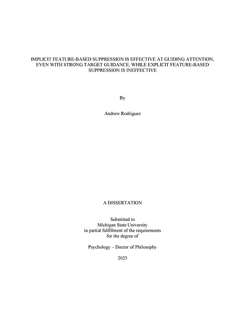 Evidence for feature-based suppression (FBS) in visual search literature has been controversial and mixed. Much of the mixed findings are due to differences between implicit FBS, the unconscious ignoring of a feature that appears as a distractor with high regularity, and explicit FBS, the active biasing of attention away from a feature. Given this discrepancy, the goal of this dissertation is to examine the benefits of implicit and explicit FBS in a visual search task. Across four experiments, participants searched for a Landolt C with a horizontal gap among eight distractors with vertical gaps, with three items appearing in each of three colors. In Experiment 1, one color (ignored color) appeared on a higher percentage of trials (80%) and always appear as a distractor. Participants were not explicitly aware of the suppression contingency with the goal that they would implicitly learn to ignore this color. In Experiment 2, we included an additional implicit feature-based gain (FBG) contingency - a color (attend color) appeared on a large percentage of trials (40%) and always as the target - to see if suppression of the ignore color persists if there is an implicit feature-based gain (FBG) component present. Experiment 3 replicated Experiment 2 but made the FBG component explicit by cuing participants about the color that was likely to be the target. Experiment 4 replicated Experiment 1 but made the FBS component explicit by cuing what color should be ignored. Experiment 1 found a strong implicit suppression benefit that required minimal training of the to-be-ignored feature. However, in Experiment 2 where there were implicit FBS and FBG contingencies, only the FBG impacted search – suggesting that implicit FBG interfered with the development or implantation of an implicit FBS mechanism. However, when the FBG component was made explicit (Exp. 3), the implicit FBS effect reappeared – suggesting the failure to find FBS in Experiment 2 was likely due to a competition for implicit resources between the FBG and FBS components. Finally, when FBS appeared alone but was made explicit (Experiment 4) there was week evidence for suppression. These findings suggest that implicit FBS can effectively allocate attention, but the circumstance under which they do so are limited – only when the contingencies are learned implicitly and in the absence of implicit feature-based gain contingencies. These restrictions may limit FBS’s utility as a real-world mechanism for guiding attention.