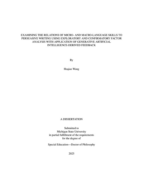 This dissertation explores the multifaceted development of persuasive writing skills among secondary school students, with an emphasis on fostering reasoning and argumentation skills essential for targeted writing tasks. Student-constructed essays serve as valuable instruments for assessing scientific literacy and higher-order thinking; however, their evaluation involves many complexities and is susceptible to potential biases and various sources of measurement error. This study addressed two primary objectives. First, it identified key features influencing persuasive essay quality by utilizing product-oriented measures to analyze both microstructural and macrostructural dimensions of writing. A latent structure of writing assessment was established, and measurement invariance was tested across students with differing special education statuses. Second, building on insights from this foundational investigation, automated feedback prompts were developed and implemented using GPT, facilitating AI-based scoring and feedback mechanisms. This research underscores the relevance of factor-analytic findings in addressing gaps related to predictive models and AI-driven content-generation tools, ultimately supporting personalized learning and adaptive written feedback. The implications of this study align with AI’s expanding role in education, offering strategic insights into maximizing AI’s utility for enhancing educational equity and instructional effectiveness. A promising approach involves leveraging factorial models to inform generative AI in delivering tailored feedback, thereby enhancing students’ writing proficiency and overall performance.