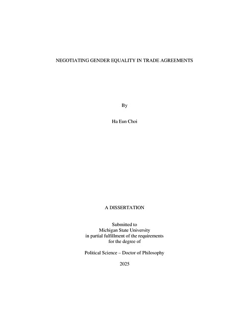 Over the past decade, gender provisions have emerged as a new frontier in the design of trade agreements. Yet their presence and substance remain highly uneven. This dissertation investigates the political drivers behind the inclusion and depth of gender provisions in trade agreements, shifting attention from structural or economic explanations to political agency—particularly executive leadership and gendered power dynamics. Using a mixed-methods approach that combines semi-structured interviews, a descriptive case study, and large-N statistical analysis, I argue that political leaders are more likely to prioritize gender issues in trade negotiations when pro-gender equality norms gain influence within the executive. The dissertation introduces a two-stage theoretical framework: first, explaining how gender provisions enter the negotiation agenda and second, how their depth is shaped by the political costs and reputational incentives faced by negotiating states. Empirical analysis of trade agreements from 1990 to 2021, using original measures of gender provision depth, shows that women’s presence in powerful executive roles is a significant predictor of the inclusion of gender provisions. Furthermore, deeper provisions are more likely when negotiating states face credibility risks or have reputational incentives to signal commitment to gender norms. The findings advance our understanding of how trade agreements serve as instruments of norm diffusion, demonstrate the importance of gendered leadership in international negotiations, and highlight the ways trade policy has become an arena for institutionalizing social norms beyond market liberalization.