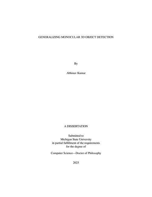 Monocular 3D object detection (Mono3D) is a fundamental computer vision task that estimates an object’s class, 3D position, dimensions, and orientation from a single image. Its applications, including autonomous driving, augmented reality, and robotics, critically rely on accurate 3D environmental understanding. This thesis addresses the challenge of generalizing Mono3D models to diverse scenarios, including occlusions, datasets, object sizes, and camera parameters. To enhance occlusion robustness, we propose a mathematically differentiable NMS (GrooMeD-NMS). To improve generalization to new datasets, we explore depth equivariant (DEVIANT) backbones. We address the issue of large object detection, demonstrating that it’s not solely a data imbalance or receptive field problem but also a noise sensitivity issue. To mitigate this, we introduce a segmentation-based approach in bird’s-eye view with dice loss (SeaBird). Finally, we mathematically analyze the extrapolation of Mono3D models to unseen camera heights and improve Mono3D generalization in such out-of-distribution settings.
