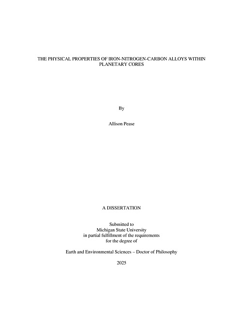 Within this thesis we investigate the physical properties of iron-carbon-nitrogen alloys with implications for planetary cores. We employ high pressure mineral physics techniques to determine the Raman Scattering of Rhenium for Secondary Pressure Calibration, investigate the Strength, plasticity, and spin transition of Fe-N compounds in planetary cores, investigate the liquid Structure of iron-nitrogen-carbon alloys within the cores of small terrestrial bodies, and measure the Physical Properties of Transition-Metal Enriched Davemaoite in the Earth's lower mantle. Terrestrial planetary cores consist of Fe-Ni alloys enriched in light elements. Nitrogen and carbon are considered potential core constituents due to their highly siderophile nature and their high Poisson’s ratio when alloyed with iron. These light-element-bearing alloys can be studied experimentally using various high-pressure devices, including the Paris-Edinburgh press and the diamond anvil cell. Accurate pressure calibration is critical for successful high-pressure experiments. Previous studies have shown that different calibrations of the same material can deviate by more than 10% in the multi-megabar regime—a significant uncertainty given that Earth’s core spans 1.3 to 3.6 Mbar. In chapter two, we review various pressure calibrations and develop a secondary pressure scale based on the Raman scattering of Re, a common gasket material in diamond anvil cell experiments. This equation of state can be used to validate pressure conditions, monitor pressure gradients across the sample chamber, and predict diamond failure. In chapters three and four, we investigate the physical properties of Fe-light element alloys. In chapter three, we examine the strength, plasticity, and a transition in the electronic spin (i.e spin transition) of solid Fe-N compounds up to 60 GPa and 300 K using the diamond anvil cell. We find that nonhydrostatic stress broadens pressure range of the spin transition, Fe-N alloys develop unique textures and lattice preferred orientation, and nitrogen strengthens Fe at high pressures. These findings, combined with elasticity measurements, can be used to model the seismic properties of planetary cores in bodies such as Mars, Mercury, and the Moon. In chapter four, we explore the liquid structure of molten iron-nitrogen-carbon alloys under high pressure using the Paris-Edinburgh press, reaching up to 7 GPa and 1900 °C. We observe that increasing nitrogen and carbon content expands the liquid volume by increasing Fe-Fe bond distances, which we model using a modified Birch-Murnaghan equation of state. From these results, we infer that nitrogen and carbon incorporation in liquid iron could contribute to the density deficit observed in the cores of terrestrial bodies. In chapter five, we shift focus to investigating the thermal equation of state of Mn- and Fe-bearing davemaoite. Davemaoite is one of the primary minerals in the lower mantle and was recently found to form a partial solid solution with MnSiO3. We measure the thermal properties of davemaoite under lower mantle conditions and determine that Mn and Fe systematically influence its thermal behavior. Specifically, Fe and Mn shift the tetragonal-to-cubic phase transition to higher temperatures. However, given the realistic abundances of Fe and Mn dissolved in davemaoite, their presence would not make it seismically distinguishable from pure CaSiO3 in the lower mantle.