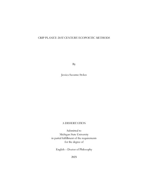 My work addresses ecopoetry written in the US and Pacific that is specifically attentive to the acceleration of slow violence and climate change, as well as the long histories that have culminated in their disproportionate impacts on disabled people and people of color, disabled and nondisabled alike. I argue that contemporary ecopoetics remains focused on creating or articulating new ways of writing poetics of relation connected to nature which elide the works of authors whose methods work ecologically with a less direct focus on the more-than-human world. Crip Planet is a methodological survey of the work of Larry Eigner, JJJJJerome Ellis, Douglas Kearney, Craig Santos Perez, Selina Tusitala Marsh, and Tusiata Avia. With the exception of Perez, these authors are rarely included in ecopoetry anthologies unless they are collections specifically attentive to race, gender, disability status, or other markers of identity; I argue for their inclusion in the field of ecopoetics precisely because their methodologies attend to vast networks of culture, nature, violence, and temporality. These authors disrupt the trend in ecopoetics to frame their writing in “an absolute break with the past,” instead bringing attention to long histories that offer contexts. Repeated calls from Black poets and poets at the heart of crip of color critique call for a move from a noun state–what Nathaniel Mackey calls “the confinement to a predetermined status”–to a verb state–the “domain of action and the ability to act.” The ecopoets here are actors within a mess, offering critical methods–verbs–for those who have been pushed out of what is considered orderly towards treatment as garbage and those who take the literal and figurative garbage of the present and transform it into a tool for survival. By attending to ecopoetic methods of the present, their places, and how they form connections, I show some ways to build strange affinities with those who have been forced into similar, messy situations. It is a methodological study that looks to poets writing now who utilize temporal care work, mess, and recycling as critical practices for surviving this moment of ecological collapse.