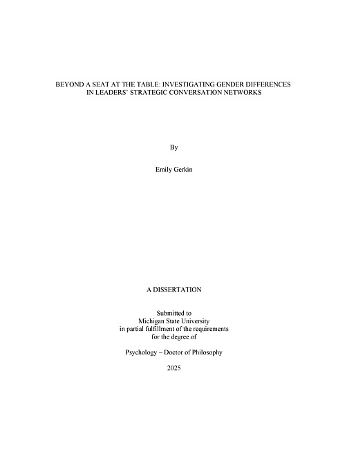 Theories related to the strategic management of organizations, such as the UpperEchelons Theory (Hambrick & Mason, 1984) and the Resource-Based View (Wernerfelt, 1984), suggest that gender diversity in leadership groups can enhance organizational strategy because women will have a tangible and unique impact on strategic decision-making. However, empirical studies based on the Upper Echelons Theory and the Resource Based View have predominantly relied on demographic representation as a proxy for women’s impact on strategy, assuming that the presence of women in leadership equates to their influence on strategic decision-making. Research on gender and networks would suggest that women leaders are not consistently involved in critical strategic conversations—even if they are demographically represented in leadership groups. This raises an important question: Are women leaders participating in strategic conversations at the same rate as their men counterparts, or are they still on the sidelines? My dissertation addressed this question by drawing from theory and research at the intersection of gender and networks. I hypothesized that homophily tendencies, combined with the gender composition of organizations, makes women leaders (1) less likely than men to be connected with men leaders, but more likely than men to (2) reach outside of their own work groups to form connections, and (3) to form gender heterogeneous ties. In turn, the composition of women’s network ties makes them less likely to occupy powerful, stable, and strong positions in strategic conversation networks. Further, I hypothesized that the extent to which leaders have connections with men leaders would be more strongly and positively associated with powerful network positions for women leaders than for men leaders. I tested my hypotheses in a sample of 673 upper- and middle-managers from 13 organizations across different industries who completed social network surveys. Results showed complex patterns. Despite women having lower network ‘power’ than men, results showed that women had significantly fewer men contacts in their strategic networks, and that such differences were unexpectedly related to increased network ‘power’ (degree centrality). The relationship between the proportion of men leader contacts and network power was more positive, but not significant for women leaders. Contrary to expectations, women also had fewer contacts outside of their immediate work groups, which led to increased network ‘stability’ (contact density). When considering the larger gender composition of each organization, having more women in organizational leadership positions or on the top management team strengthened the positive indirect effect of gender on network power through having fewer men contacts. Rather than being excluded from strategic conversations as the gender and networks literature might suggest, women appear to develop alternative networking approaches that can effectively increase their involvement in strategy networks. By moving beyond demographic representation to analyze how men and women leaders participate in strategic networks, the present dissertation offers important insights into the mechanisms that shape involvement in organizational strategy networks and women’s career advancement.