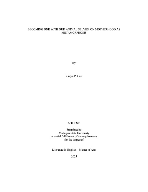 This project simultaneously enters and tracks the liminal spaces and positions that the (non)human female body inhabits as it oscillates between human and animal corporeality, especially through the process of “becoming-mother.” Turning to Rachel Yoder’s Nightbitch (2021), K-Ming Chang’s Bestiary (2020), and Emily Habeck’s Sharkheart: A Love Story (2023)–three contemporary feminist speculative fiction novels published in the past five years that effectively respond to the current social and political climate surrounding the instable discourse of women’s reproductive and individual human rights–I interrogate the ways in which humanity, animality, and motherhood fluidly coexist and permeate each other in alternative worlds that allow women to reclaim and explore the true power of their (non)human female bodies. By first examining the physical and psychological differences that exist between the pregnant and maternal body and how they then inform the intrinsic bond forged between a mother and her offspring, this project brings these three novels together to follow the female body along its corporeal process of becoming both “mother” and “animal.” Put in conversation with the critical theory coming out of posthumanism, animal studies, new materialism, feminist science and technology studies, and maternal feminist thought, these three novels celebrate the female body across human and nonhuman worlds to showcase women’s ability to resist patriarchal capture and dismantle the cultural illusions of control that still work to define their corporeality and (non)human identity.