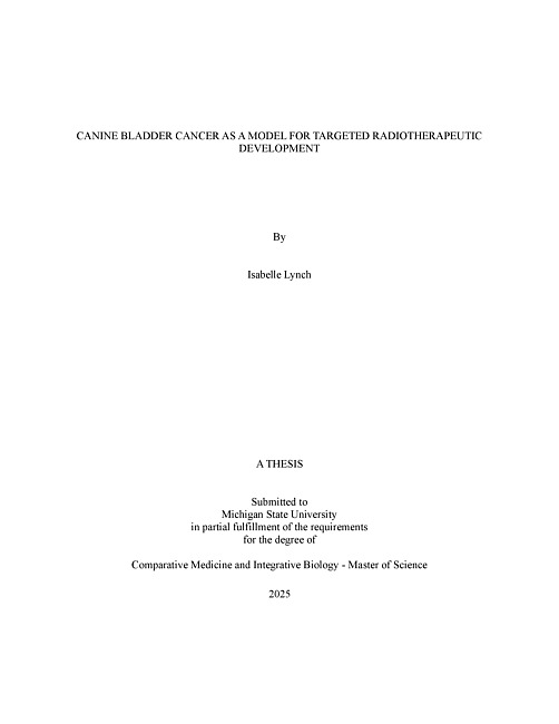 The more advanced form of bladder cancer (BC), muscle-invasive bladder cancer (MIBC), remains a significant clinical challenge in both canine and human patients afflicted with the disease. Although non-muscle invasive bladder cancer is the more dominant subtype, cases often reccur or progress, even after treatment. Despite current treatment options like chemotherapy, cystectomy, and external beam radiation, invasive bladder cancers have poor prognosis, with a 50% mortality rate in humans, and dogs are rarely cured. Dogs naturally develop bladder cancer in the presence of a complete immune system, making them an ideal preclinical model for studying human bladder cancer and developing novel targeted therapies as opposed to current available murine models. This study investigated the potential of radiolabeled FDA-approved monoclonal antibodies dual-targeting EGFR1 and EGFR2 biomarkers for treating canine bladder cancer and the possibility of eventually translating these findings into human treatment.This thesis project aimed to characterize EGFR1 and EGFR2 expression in five different canine bladder cancer cell lines using technetium-99m binding assays, and confirming the binding affinities of monoclonal antibodies cetuximab and trastuzumab for these receptors. Colony formation assays were conducted to assess the impact of radiation therapy using beta-particle therapy (Lu-177-[cetuximab/trastuzumab]) and were compared with results from studies performed without radiation. Findings suggested that the antibodies alone do not have an inhibitory or proliferative effect on the canine bladder cancer and that any theraputic effects may be attributed to that of the radiation alone. Additionally, this study supports the use of targeting radiation therapy as a more promising treatment for both canine and human bladder cancer, with the potential for reduced off-target effects when compared to traditional radiation therapies, like external beam radiation therapy. The utilization of pet dogs as a model for MIBC is particularly advantageous, given that canine bladder cancer closely resembles the disease in humans. Overall, this approach could accelerate the development of targeted radiotherapies and improve treatment outcomes for both veterinary and human patients. Leveraging similarities between canine and human bladder cancer should allow for enhanced therapeutic strategies that expedite the translation of novel therapeutics into clinical practice, a win-win scenario for canine and human patients alike.