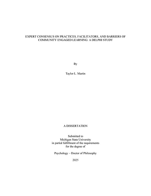 Community engaged learning (CEL) is a promising pedagogical approach to higher education that promotes mutually beneficial partnerships with communities (Nguyen & Condry, 2023). To date, there are not well-established best practices for CEL (Da Cruz, 2018; Nguyen & Condry, 2023). To address this gap, I conducted a two-phase Delphi study that allowed me to: (1) describe how CEL is incorporated into undergraduate education across higher education institutions in a land-grant, research-intensive university’s sphere of influence; (2) identify facilitators and barriers to the success of CEL in undergraduate higher education across these same institutions; and (3) identify concrete supports that a land-grant, research-intensive university could offer to enhance and strengthen CEL in undergraduate education within their sphere of influence. In phase one, I identified and recruited 15 expert CEL practitioners to participate in interviews regarding CEL techniques and practices, factors influencing implementation, and the role of MSU in promoting CEL. I then analyzed transcripts of these interviews to identify overlapping themes and practices. In phase two, I asked these experts to rate the themes and practices emerging from phase one based on their impact and, in the case of techniques and practices, the effort required to implement them. Findings inform recommendations for best practices in CEL implementation and the role of higher education institutions in supporting the practice. They also provide information pertaining to factors that impact CEL implementation. These findings should be further examined in the future by other researchers. Practitioners can use findings to assess and improve their CEL practice.