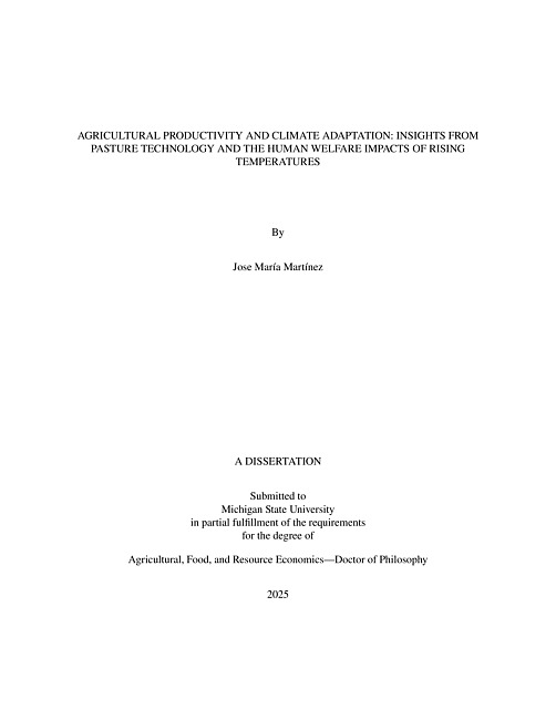 Productive sustainability and climate adaptation strategies in agriculture and development are key goals of global public policy. Understanding how agricultural technology can boost productivity in sectors like cattle ranching, and how rising temperatures directly and indirectly affect human well-being is essential for shaping effective policies in both developed and developing countries. The first chapter examines the impact of introduced pastures on lowland ranching productivity in Latin America. The final two chapters evaluate how rising temperatures influence human capital accumulation and crop yields in Colombia and the US, respectively, and how students' and farmers' behaviors modify these effects.The first chapter examines three critical questions about introduced pasture adoption in Colombian lowland ranching. First, it estimates the impact of using Brachiaria grass, a high-nutrient grass forage variety, on farm-level carrying capacity and livestock revenues. Second, it assesses whether combining complementary practices like fertilization and weed control boosts the impact of using these pastures. Third, it evaluates the potential reduction in land demands for cattle ranching attributable to introduced grasses. The study follows an instrumental variable framework, combining a cross-sectional representative sample of Colombian lowland ranchers, historical data on violence and weather, and spatial information on the location of R&D centers that disseminate knowledge about intensive grazing systems. The use of pastures significantly increases farms' carrying capacities, although at levels below those suggested by agronomic trials. In addition, our analysis suggests that gains from productivity are more significant when combined with complementary practices and that, in the absence of these introduced pastures, reaching similar output levels would have potentially required twice as much land as currently used.The second chapter studies the impact of exposure to increasing temperatures on human capital accumulation, with particular attention to the potentially differentiated effects between rural and urban settings. Combining rich microdata from a high-stakes, national-level high-school exit exam in Colombia (Saber 11) between 2014 and 2019 with weather-station-level information, we use a fixed-effect estimation to measure the effect of increasing average temperatures on student success. We find that a one degree Celsius temperature increase significantly decreases math and overall test scores in urban settings, while there is an apparent positive effect among rural students. Leveraging time-use data, we find evidence of individuals in rural areas responding to increases in temperature by reallocating time towards off-farm activities, which are human capital intensive. Finally, we use information from the announcement of a national scholarship program that introduced exogenous variation in the stakes of Saber 11, to find that the impact of the scholarship policy decreases as temperatures increase. Our analysis underscores how the effectiveness of incentive-based policies may be hindered in the context of a warming world.The third chapter explores the impacts of heat on crop yields and crop production decisions among sorghum farmers in Kansas, U.S. This analysis addresses a two-part question often overlooked in climate econometrics. Specifically, we examine whether (a) the unbalanced nature of yield panel data likely reflects strategic behavior by farmers when deciding whether to grow sorghum, and (b) whether this leads to estimation bias from sample selection. Our results suggest that (1) a farm’s decision to produce sorghum in a given year is likely a climate-sensitive response, indicating an underlying climate adaptation strategy, and (2) accounting for this response as a driver of sample selection results in lower estimates of heat impacts on yields compared to the existing literature. Our results highlight the need to further consider how farm data discontinuity in long-term panels can affect the consistency of traditional fixed-effect estimates.In conclusion, livestock farming still needs to boost productivity, and the first chapter offers insights into how agricultural technologies, like introduced pastures, can help achieve this. Meanwhile, the second and third chapters emphasize the importance of accurately assessing the impacts of rising temperatures on human welfare---specifically in terms of human capital and food production--and contribute to the broader policy discussion on global climate adaptation strategies.