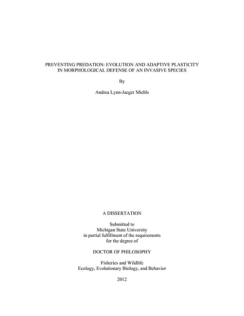 Invasive species are one of the leading threats to global biodiversity, but until recently, little attention has been paid to how evolution contributes to invasive species effects despite important applications to conservation and our general understanding of evolution in the wild. Invasive species often experience strong selection upon introduction, which may result in adaptive evolution that could facilitate their successful integration into food webs and their effects on native species. Recent species invasions in North America offer a strong opportunity to address fundamental questions in evolutionary ecology as well as advance our understanding of invasive species effects. Bythotrephes longimanus (the spiny water flea) is a predatory zooplankton with a conspicuous tail spine that invaded the Great Lakes region during the 1980s and may be having large negative effects on fisheries. Previous field studies show the morphology and life history of Bythotrephes strongly vary spatially and temporally, but the cause is not known. Evolution by natural selection and phenotypic plasticity are potential sources of Bythotrephes trait variation, but heretofore, these sources of variation have not been investigated.My dissertation research investigated ecological and evolutionary factors that influence morphological and life history variation in Bythotrephes. Using Bythotrephes collected from Lake Michigan, I found moderate-to-high genetic variation in distal spine and body length and maternal effects in both traits. Further, experiments revealed that spine length, body size, and clutch size respond plastically to temperature but not to fish predator cues, with higher temperature inducing mothers to have smaller clutches of larger offspring (longer absolute distal spine and body length) that were better defended against predation. Although Bythotrephes use temperature as the proximate cue of plasticity, it is likely that the trait changes represent adaptations to varying fish predation risk which correlates with water temperature. I also found temporally and spatially variable selection on distal spine length consistent with seasonal changes in gape-limitation of fish predators and spatial heterogeneity of fish, respectively. Yet, despite net selection for increased distal spine length, I observed little evidence of an evolutionary response to selection based on comparisons of historic and contemporary wild-captured individuals and retrieved spines from sediment cores. In a companion study of Canadian Shield lakes, I identified gape-limited fish predators as agents of selection on Bythotrephes distal spine length. Specifically, I found selection for increased distal spine length in lakes dominated by a gape-limited fish predator and no significant selection in lakes dominated by a non-gape-limited fish predator. A large difference (20%) in average distal spine length between lakes of each predator type was consistent with the direction of selection, suggesting potential local adaptation of distal spine length to gape-limited fish predation.The results of my dissertation indicate Bythotrephes respond to fish predation through multiple mechanisms, including phenotypic plasticity and evolutionary responses to selection. These responses to predation likely promote Bythotrephes success as an invasive species, and may also underlie negative effects on important Great Lakes fisheries through food web interactions. More generally, the results of my dissertation suggest the effects of invasive species may occur not just through their ecological interactions, but also through evolutionary and phenotypically plastic trait modifications. As invasive species continue to affect biodiversity worldwide, understanding the mechanisms behind invasive species effects is critical.