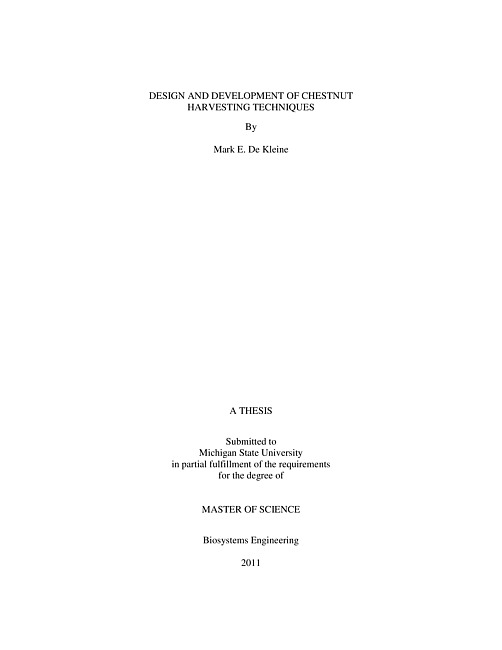 DESIGN AND DEVELOPMENT OF CHESTNUT HARVESTING TECHNIQUESByMark E. De KleineA harvesting technique applicable for small chestnut orchards was designed and tested for chestnuts. The originality of the technique was a single-stage vacuum and separation process. A harvesting chamber was designed with inline obstructions which separate chestnuts from debris. The chestnuts were sorted into a deposit chamber and debris and waste was discharged to the environment.Tests were made to determine chestnut harvesting performance as affected by the proportion of chestnuts to debris, and the feed rate into the system. The validation of the harvesting process was characterized by chestnut loss and separation efficiency. The quantity of chestnuts and the feed rate interaction significantly affected the harvesting performance parameters. Chestnut losses were as low as 1.3% while the separation efficiency was as high as 81%.