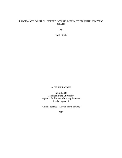 The concept that feed intake is controlled by hepatic oxidation of fuels has developed over the last several decades, mostly with laboratory species. Propionate has been implicated in the control of feed intake in ruminants, and the mechanism is consistent with simulation of hepatic oxidation. Previous research in our laboratory has demonstrated that intraruminal propionate infusion, compared with iso-osmotic acetate infusion, is more hypophagic in early lactation than in mid-lactation dairy cows. Three experiments were conducted to investigate the mechanisms related to the control of feed intake in early lactation dairy cows. The first experiment was a randomized block design with 30 lactating Holstein cows from 3 - 40 days in milk (DIM) to evaluate the extent of hypophagia from intraruminal propionate infusion for cows in early lactation. Intraruminal propionate infusion, compared with iso-osmotic acetate infusion, depressed dry matter intake (DMI) 20%. There was an interaction between treatment and DMI such that propionate was increasingly hypophagic for cows with greater hepatic acetyl CoA concentration. The second experiment evaluated longer-term infusions over 3 d to identify adaptive mechanisms using 12 lactating Holstein cows from 2 - 13 DIM in a cross-over design experiment. Propionate infusion decreased DMI over the 3-d infusion period, however a treatment by period interaction was detected. During period 1, propionate infusion, compared to acetate infusion, decreased DMI by 18% by decreasing meal size by 21%. Similar to the results of the first experiment, propionate was more hypophagic than acetate for cows with greater hepatic acetyl CoA concentration. However, there was no treatment by day interaction for DMI suggesting that cows did not adapt to intraruminal propionate over the 3 d infusion period. The third experiment was designed to evaluate the effects of intravenous lipid infusion on feed intake response to intraruminal propionic acid infusion by lactating cows. Eight lactating Holstein cows past-peak lactation were used in a replicated 4x4 Latin square experiment with a 2x2 factorial arrangement of treatments. Lipid infusion, compared to a saline control, did not affect plasma non-esterified fatty acid (NEFA) and β-hydroxybutyrate (BHBA) concentrations, but did increase hepatic acetyl CoA concentration. Intraruminal propionate infusion, compared to a sham control, decreased DMI 15%, but lipid did not affect DMI. There was no interaction between lipid and propionate for DMI, likely because lipid infusion failed to mimic the metabolite concentrations of cows in a lipolytic state. Collectively, these experiments provide strong evidence that propionate is more hypophagic for cows in a lipolytic state. Additional research is needed to evaluate the longer-term effects of propionate and its application to diet formulation for cows in the postpartum period.
