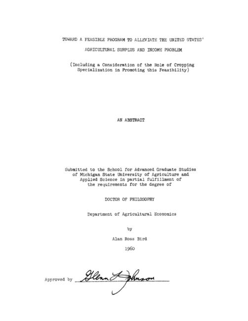Toward a feasible program to alleviate the United States' agricultural surplus and income problem (including a consideration of the role of cropping specialization in promoting this feasibility)
